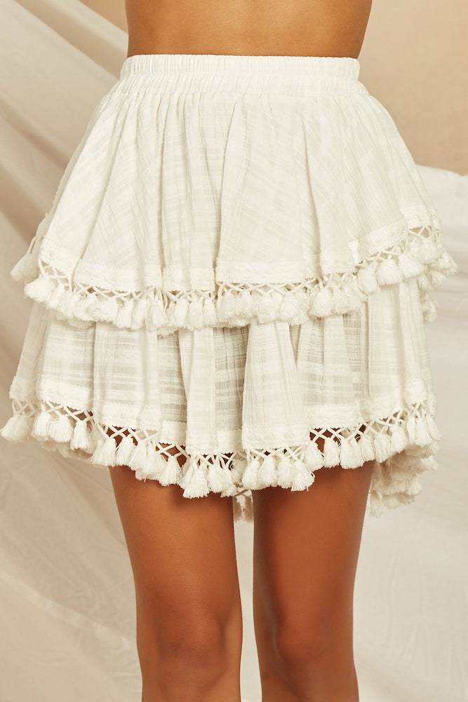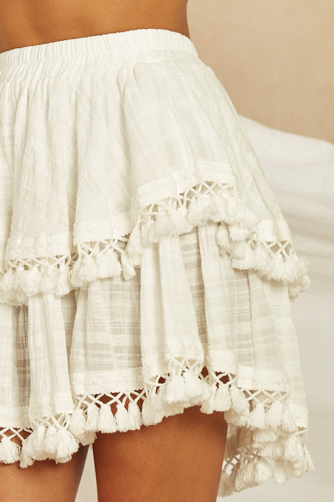 We're spending our days poolside posing in our with nothing but the sun on our cheeks and a margarita in hand. The Bellevue Mini Skirt features a sweet tassel trimming, tiered ruffles down the skirt and an elasticated waist band. Complete your Fortunate One look with our Bellevue Crop Top.