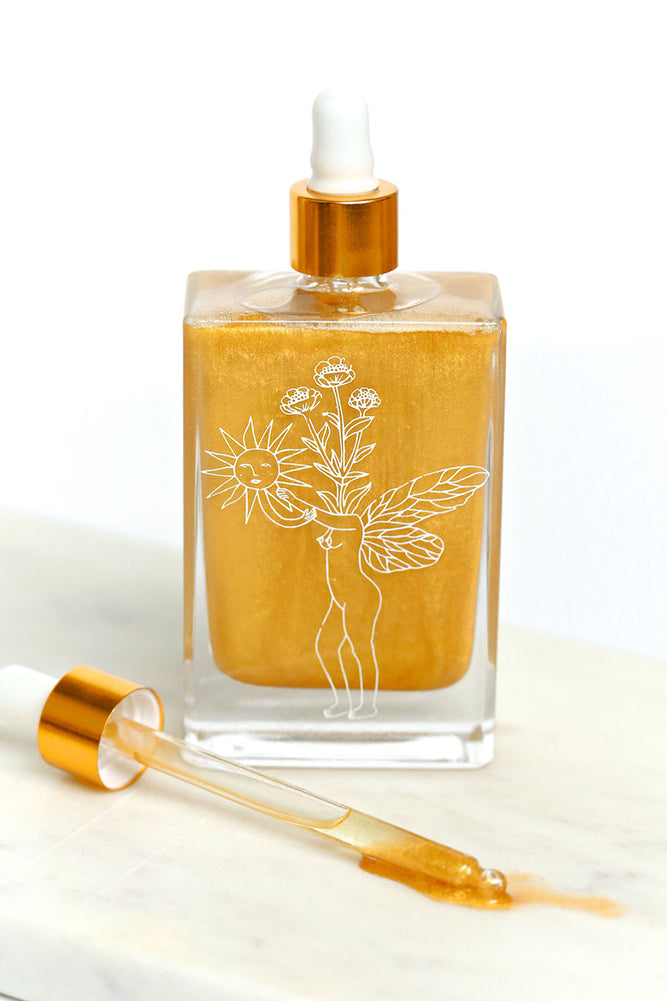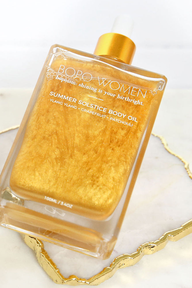 - The all-natural Summer Solstice Body oil features an uplifting blend of essential oils as well as gorgeous natural mica shimmer. Use for soothed skin with a sun-kissed natural oil.