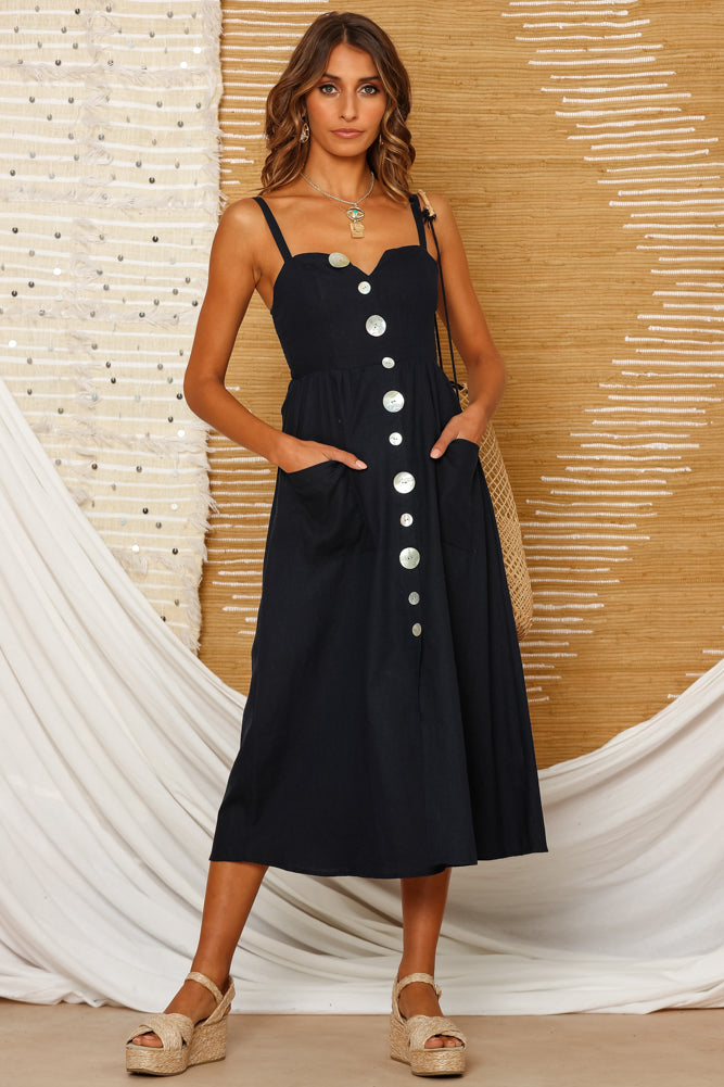 Summer sundowners, humid air and the taste of a homemade margarita with close friends is where you'll find us in our Chalmette Midi Dress. Featuring mother-of-pearl detail buttons, and invisible back zipper and mid length cut. Style yours with shell accessories and a woven wedge!