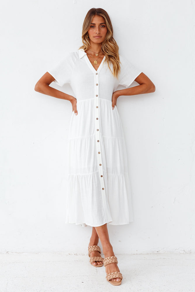 We're dreaming of sunny days and cocktails in Santorini as we relax in the Circe Maxi Dress White! Style yours with a crossbody bag and comfortable sandals.
