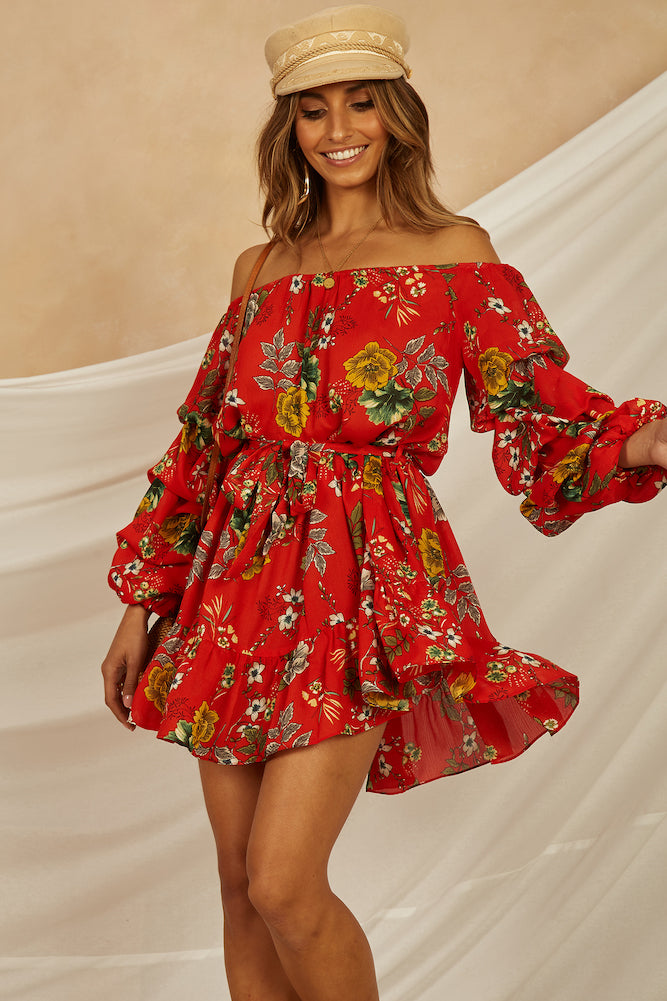 We're seeking adventure, eating locally and plan to do it all again tomorrow in our Contento Dress. This sweet style features a light-weight floral fabric throughout, off-the shoulder neckline , waist tie and long ruched sleeves. Style yours with brown booties and a rancher hat this festival season!