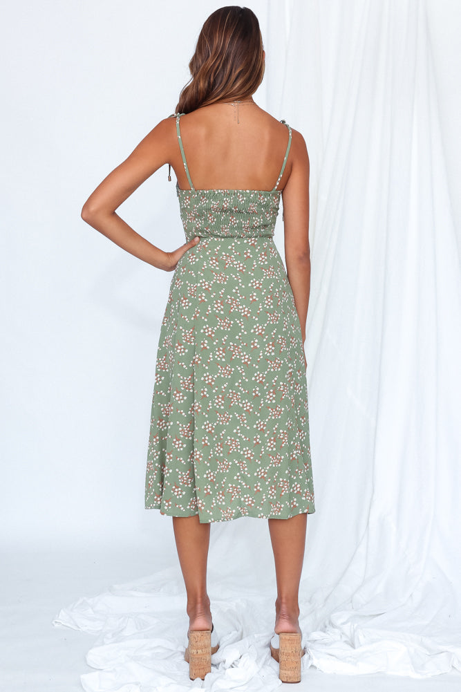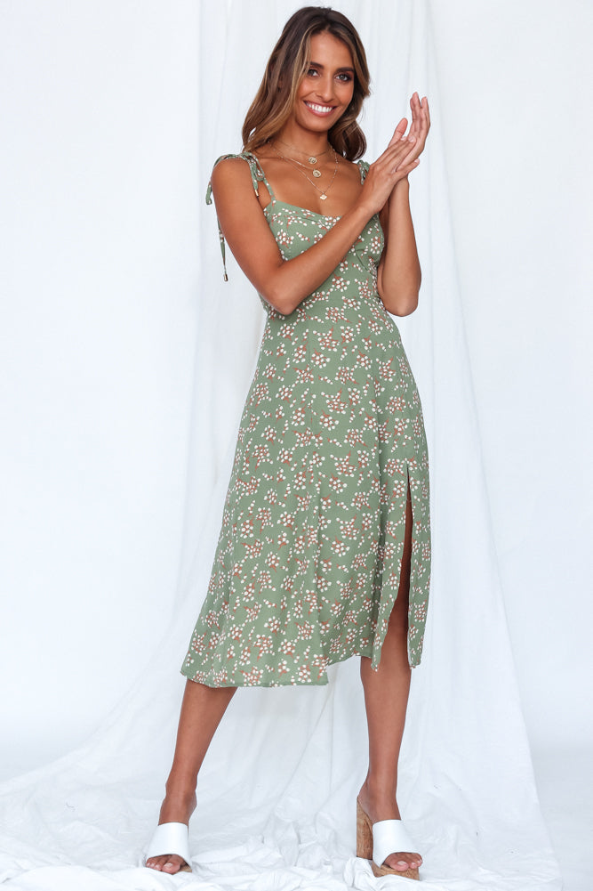 Catch us frolicking in the sun in our Dame Nature Midi Dress! Style yours with woven wedges and a straw bag.