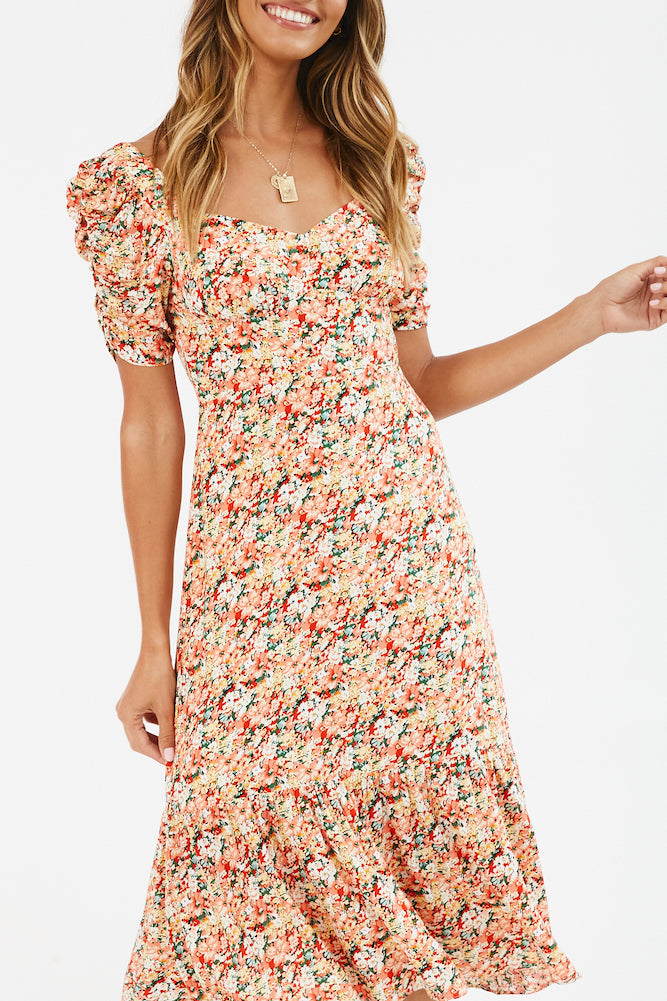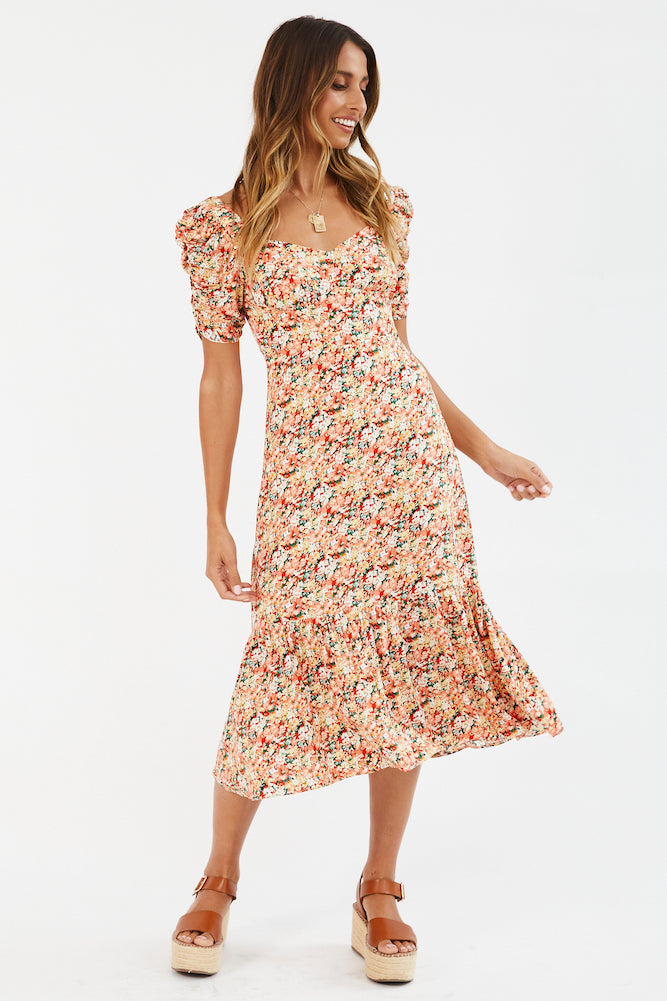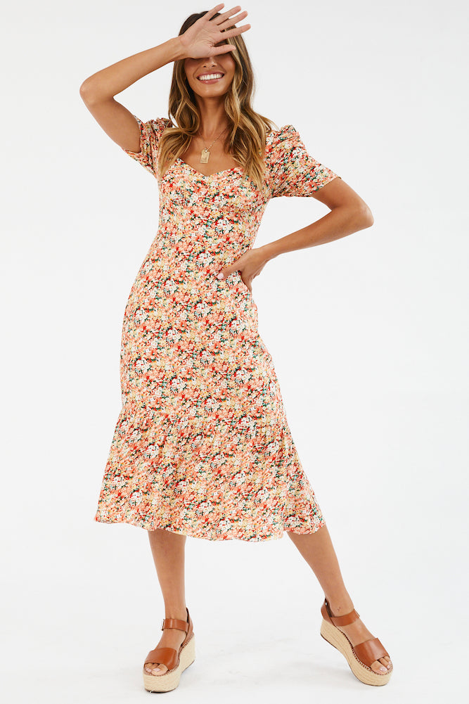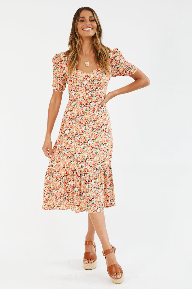 The Floral Cascade Midi Dress reminds us of colourful summer adventures through Marrakech! Style this stand-out midi with neutral block heels and gold adornments for your next harbourside party.