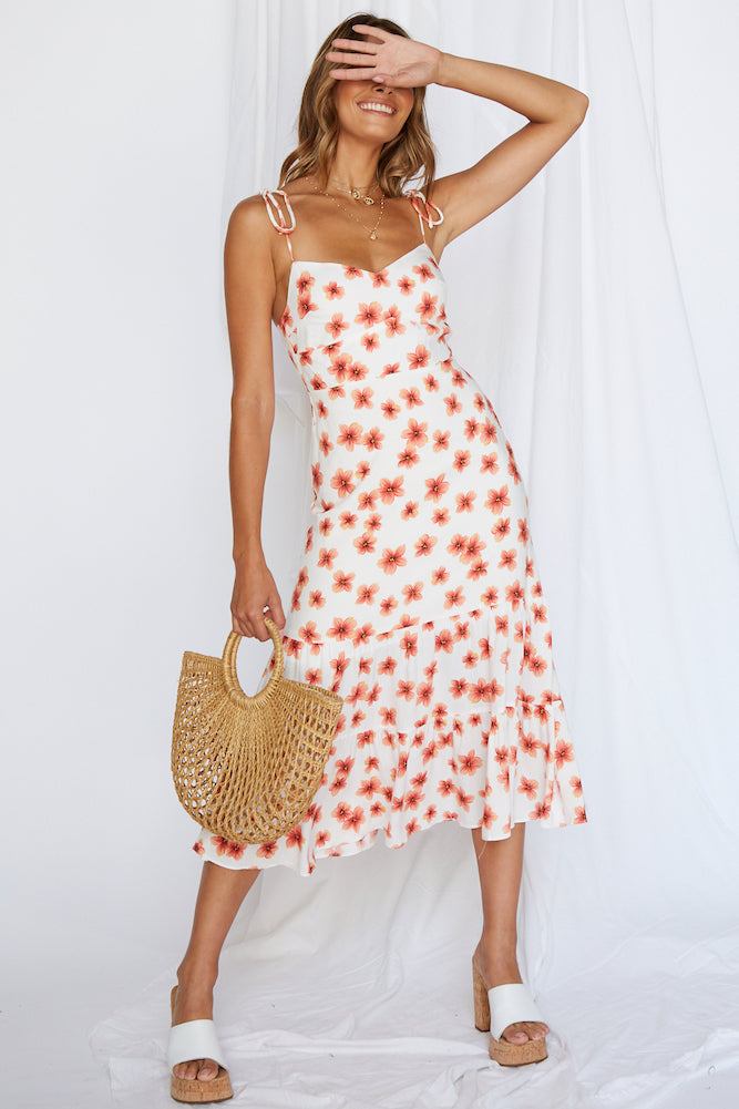 Our Floral Scene Midi Dress was made for your tropical vacay! Style yours with slides and a woven bag.