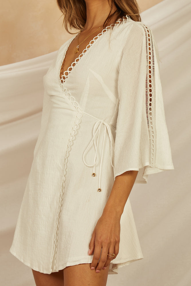 We're 'seasing' the day at the beach with the salt in our hair and the sand between our toes. Between swims we're throwing on our Granvia Valmonte Dress. This style features a intricate trimming along the neckline, flared long sleeves and tie up front with gold hardware.