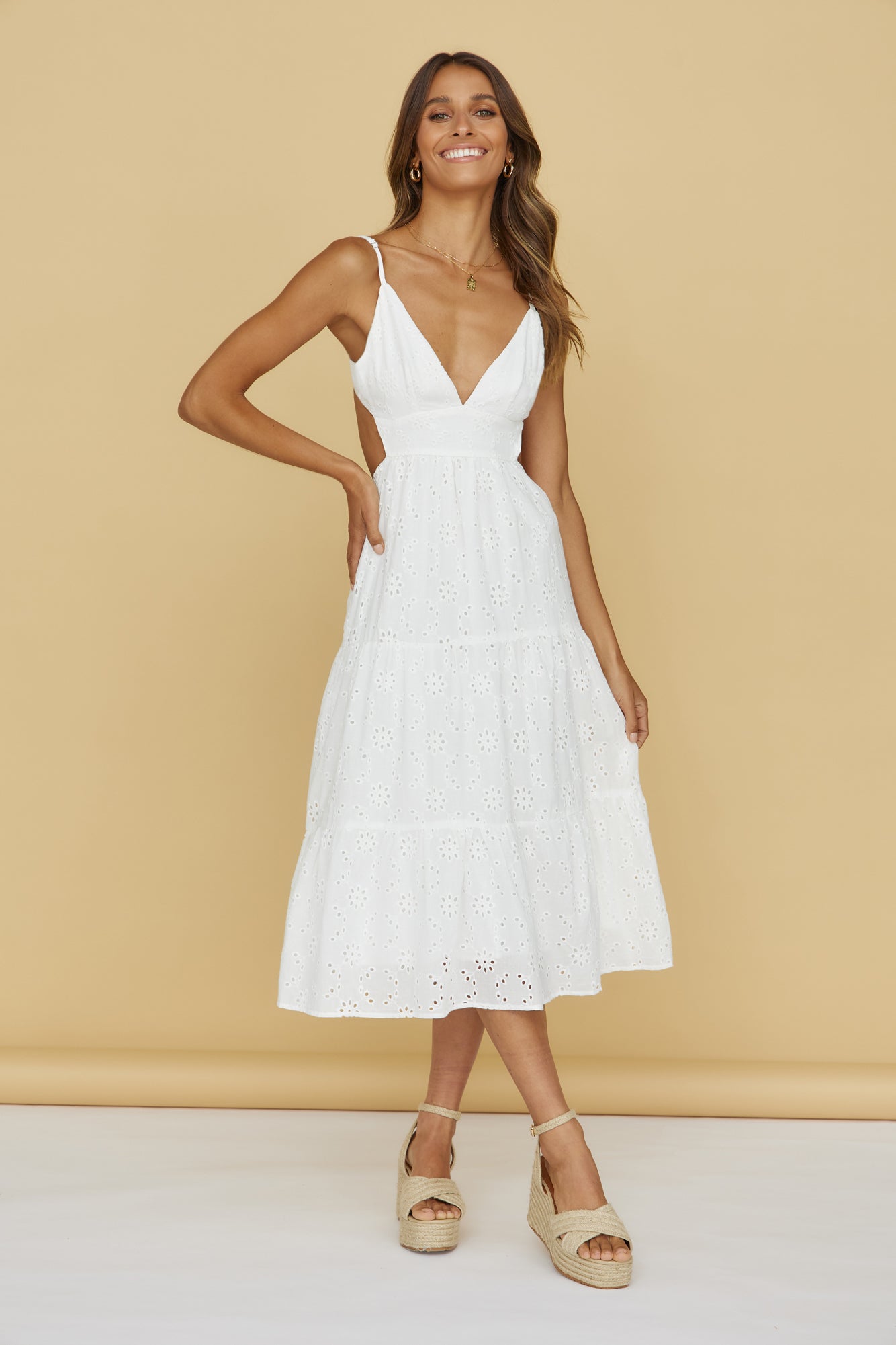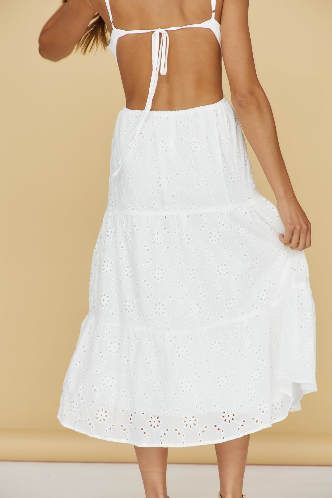 - Broderie anglaise detailing throughout
