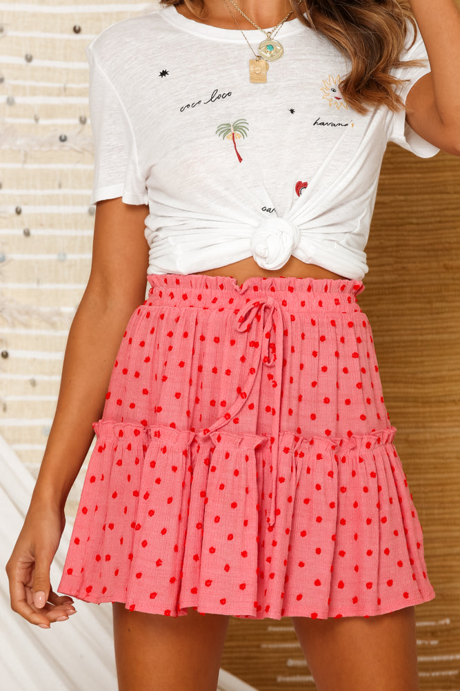 We're giving into our sweet side in our Kinsella Mini Skirt. This polka dot style features a subtle tiered frill along the skirt, elasticated waist band and tie up front with intricate silver hardware. Finish the look with a vintage cropped leather jacket!