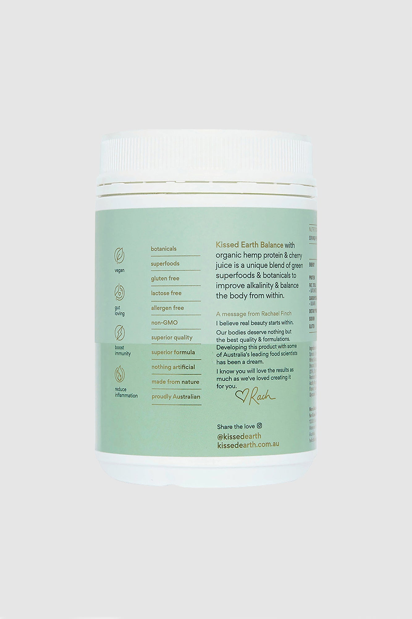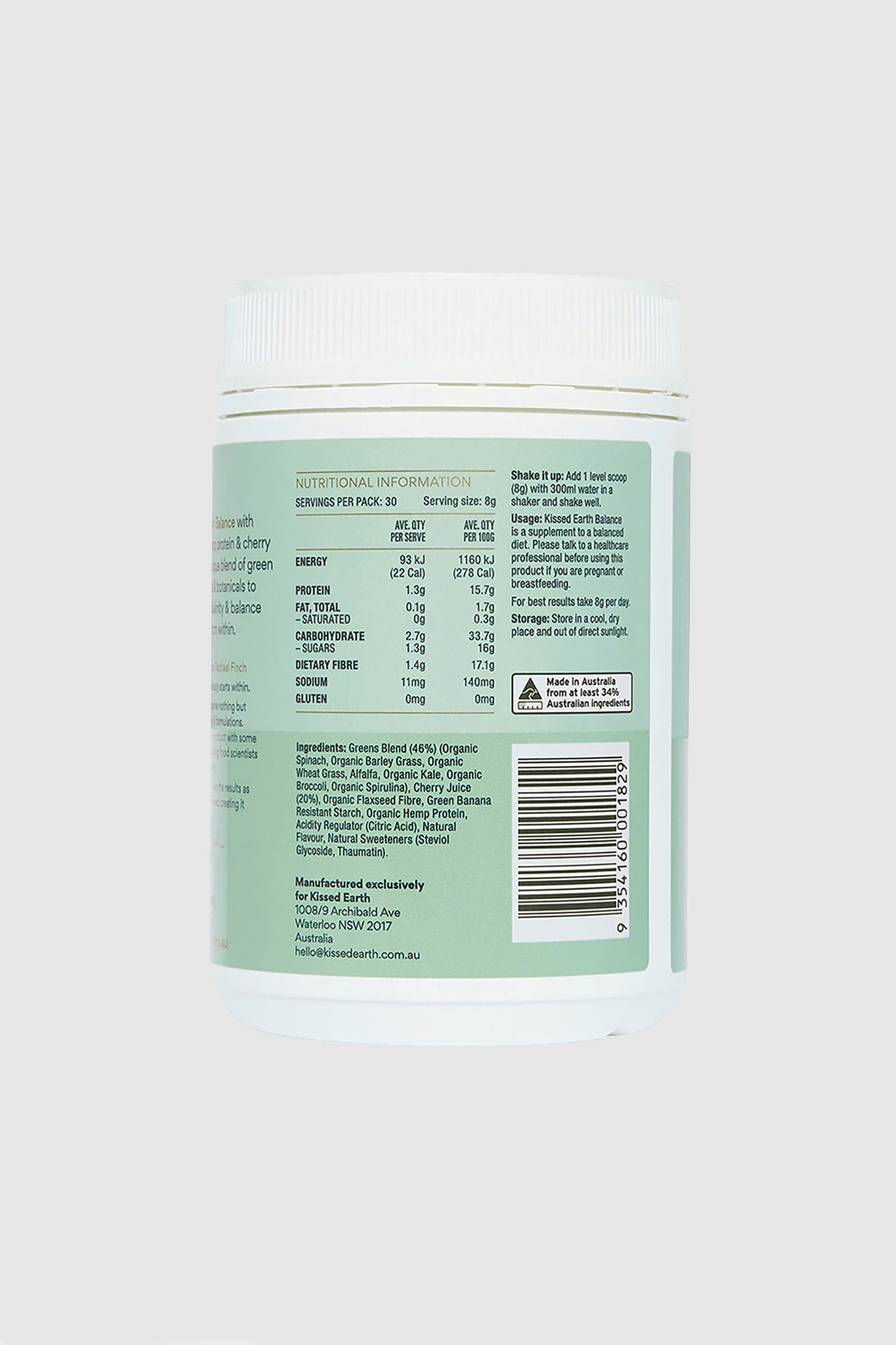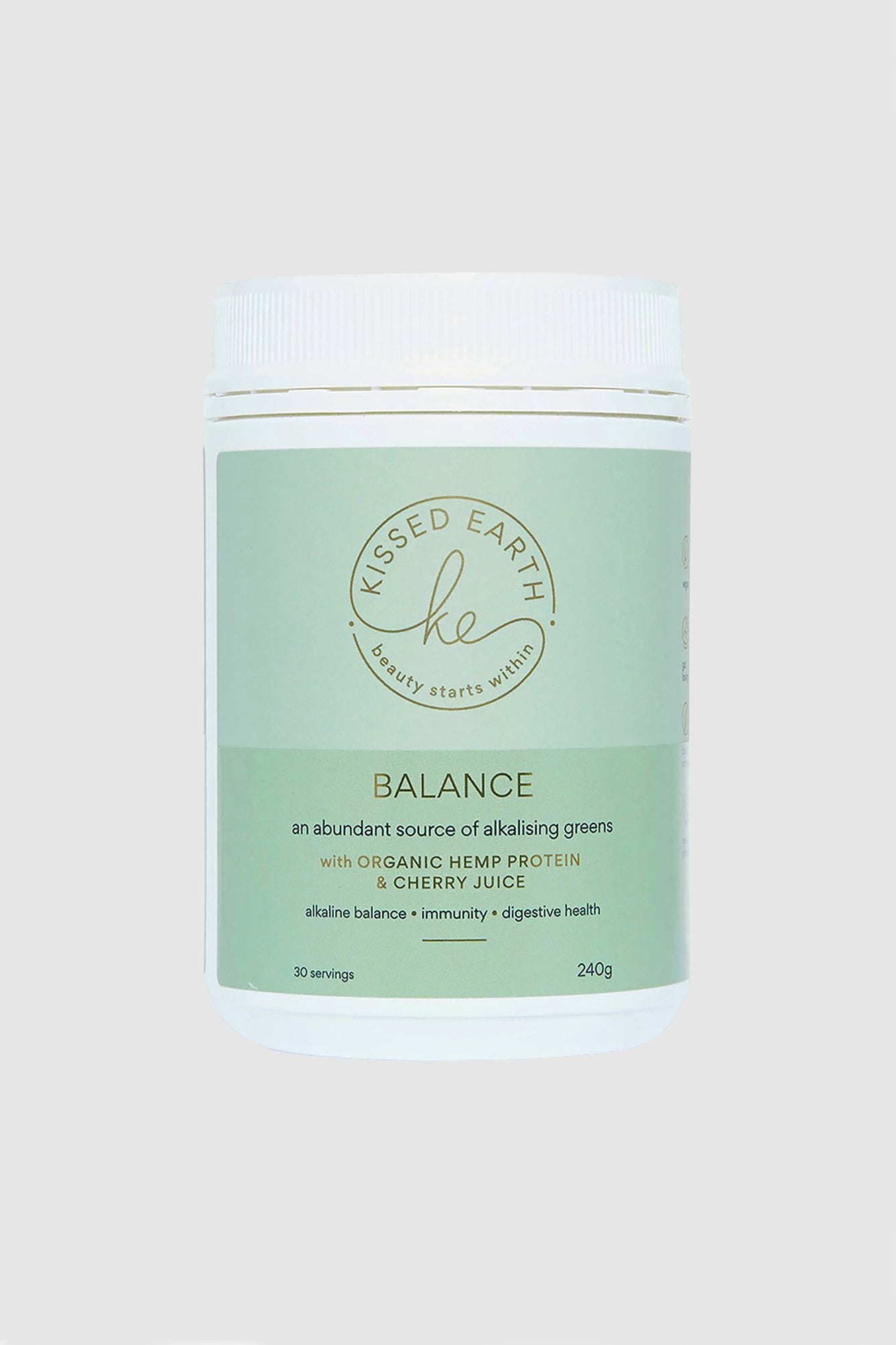 Kissed Earth Balance with organic hemp protein & cherry fruit extract is our unique blend of 7 organic super greens & botanicals designed to improve alkalinity & balance the body from within. Packed with nutrients, Balance works to boost energy levels, heal the gut, promote healthy digestion, reduce inflammation in the body and so much more!