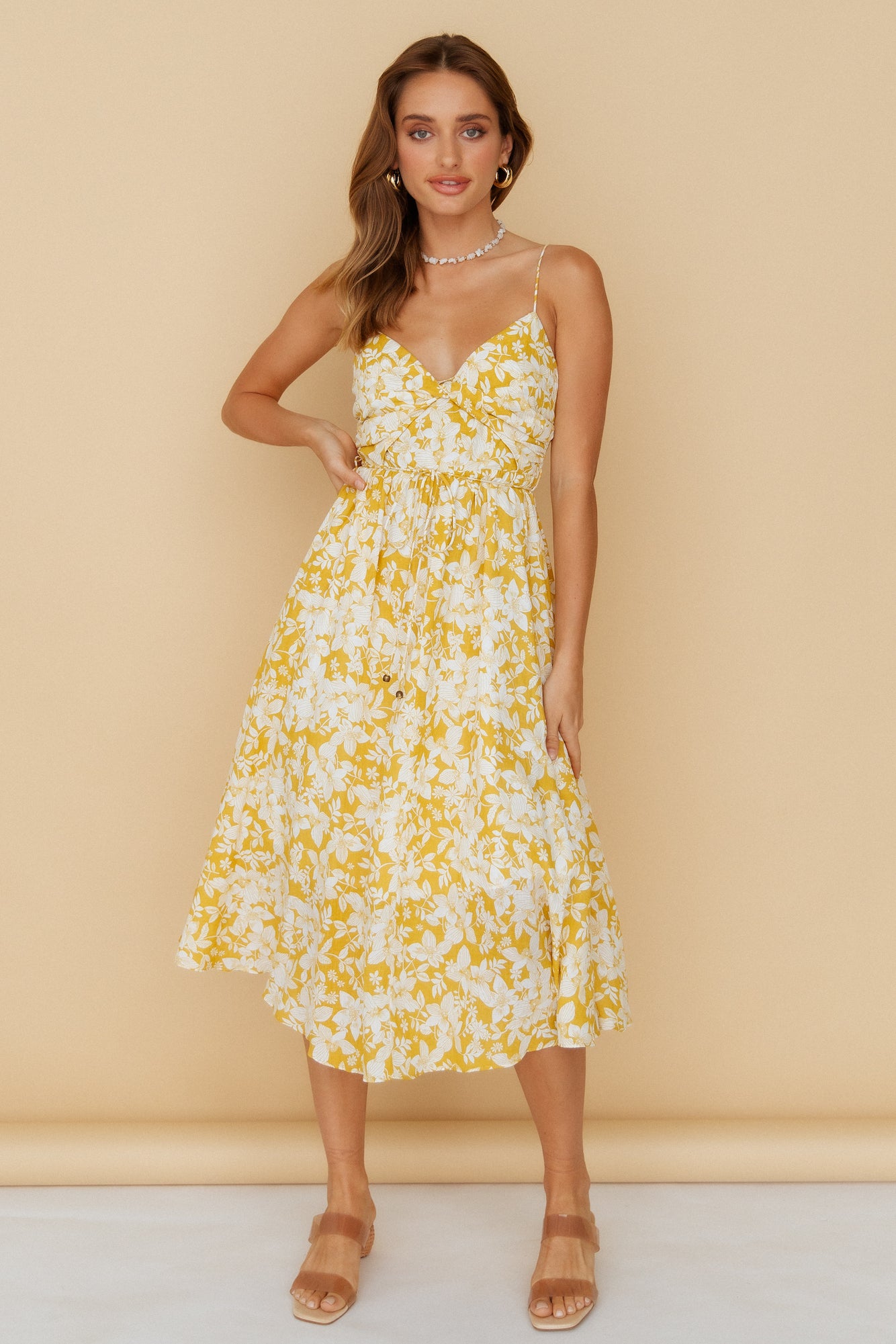 The Knowing It All Midi Dress calls for sweet summer picnics and slow days by the ocean. Style yours with neutral block heels and gold adornments.