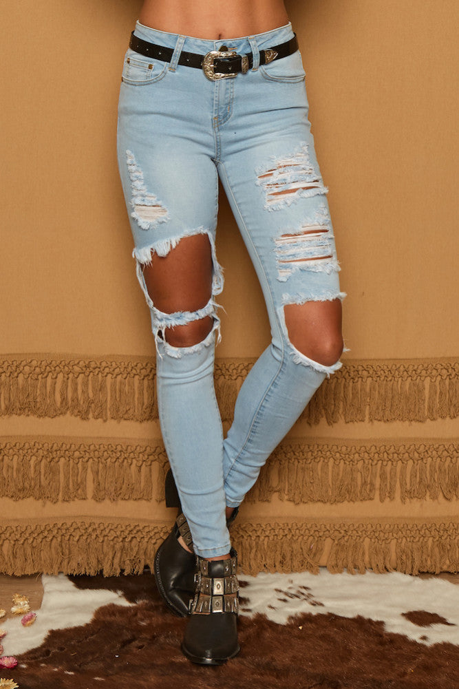 - Distressed and cut out detailing along front