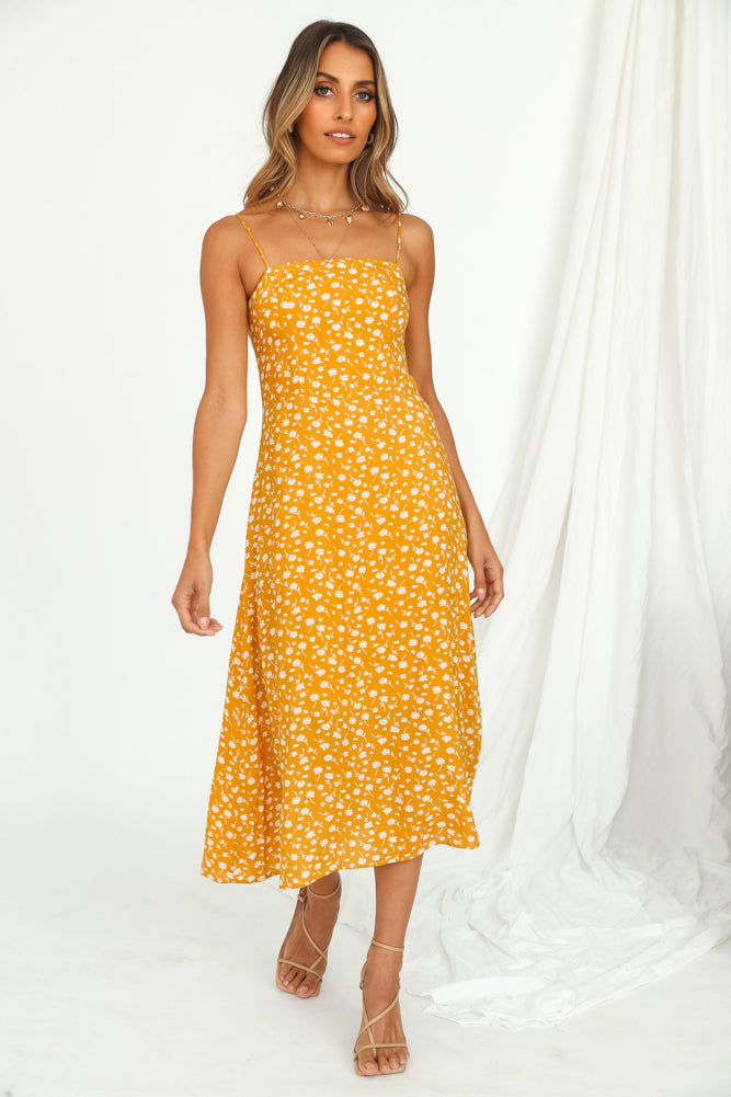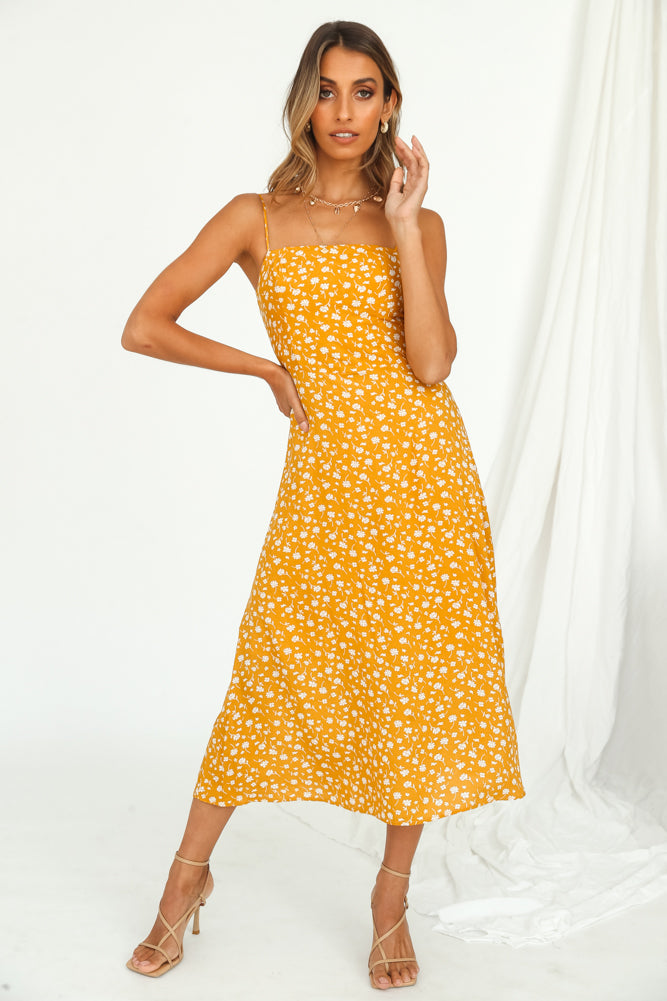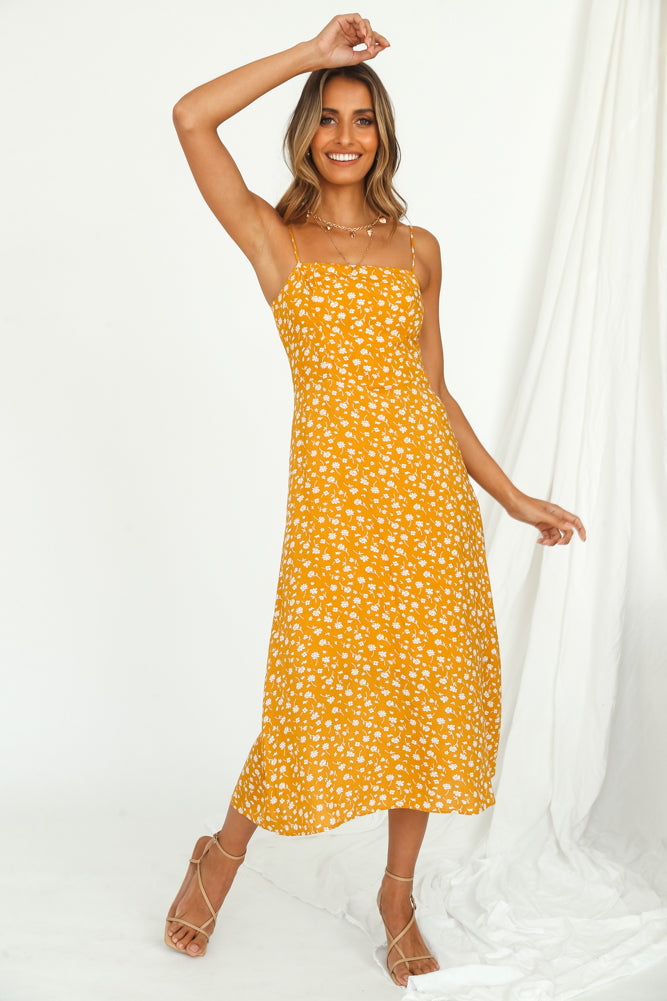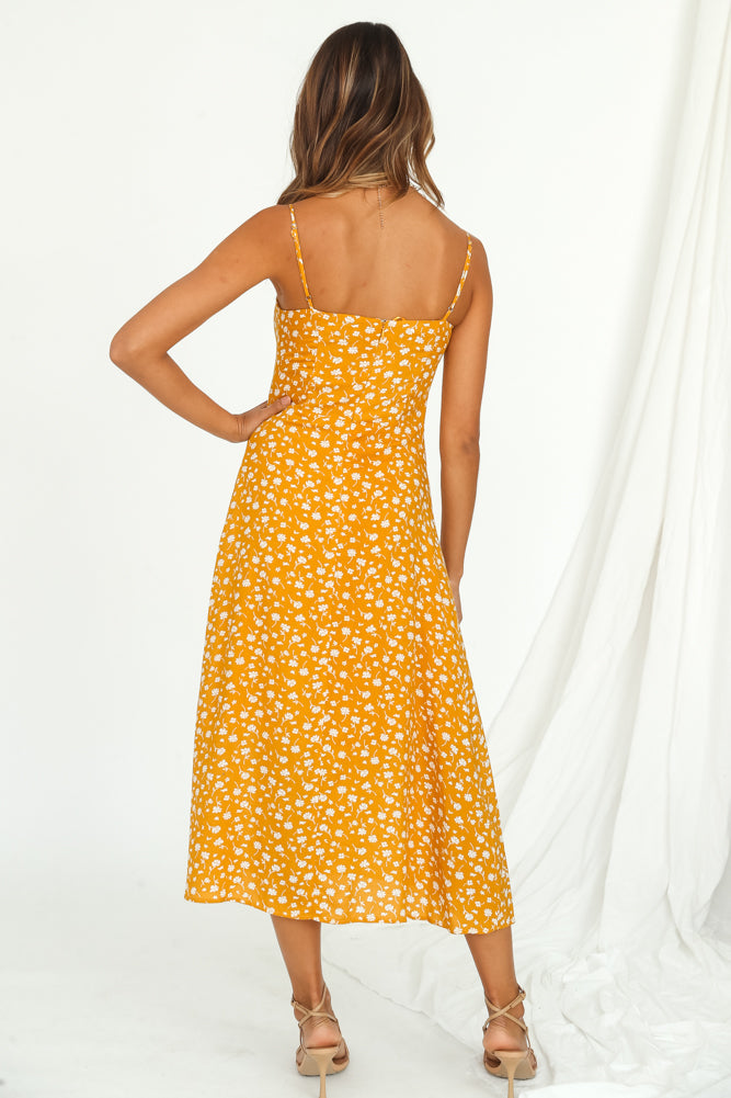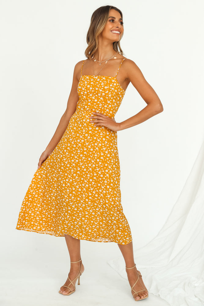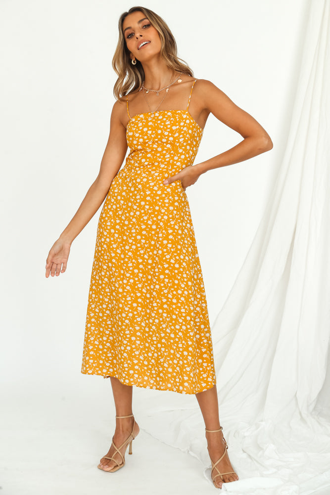 Shine bright in our Little Bird Midi Dress! Style yours with high block heels and a woven bag.
