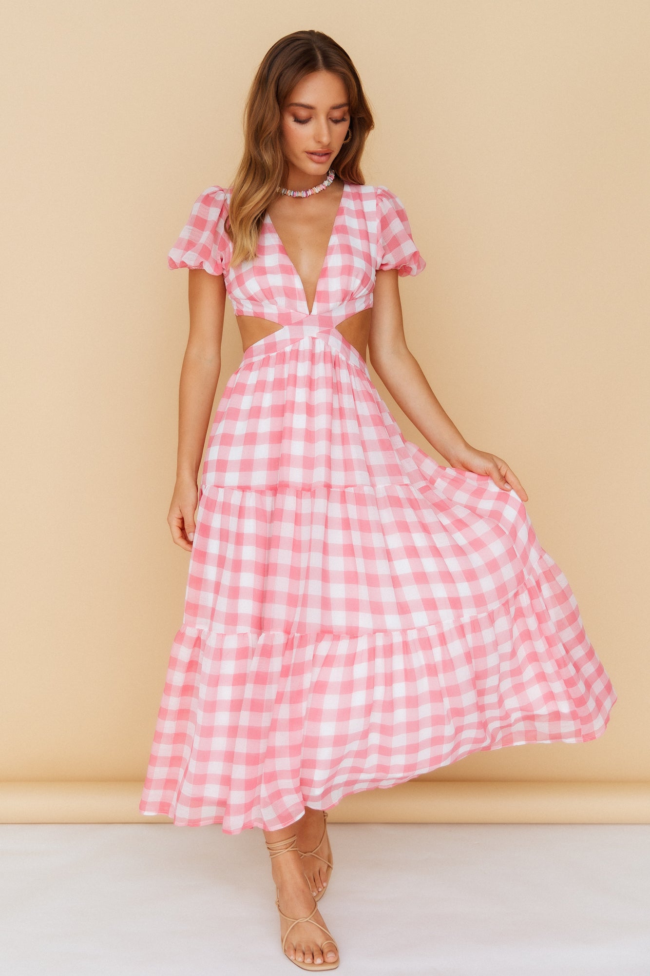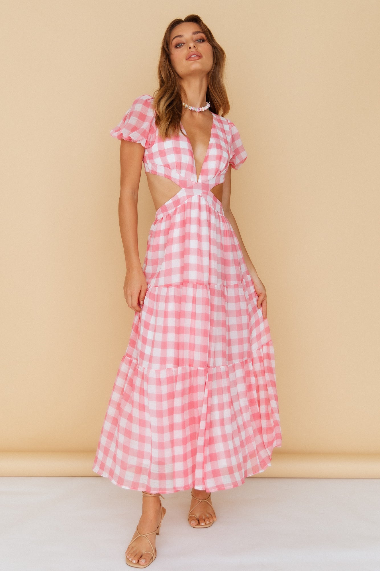 Featuring sweet gingham and cheeky cutouts, our Little Bit Of Love Maxi Dress is the perfect look for picnics in the city! Style yours with neutral block heels, gold adornments, and lightly tousled hair.