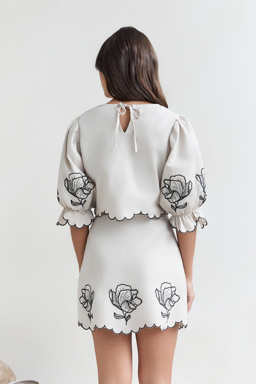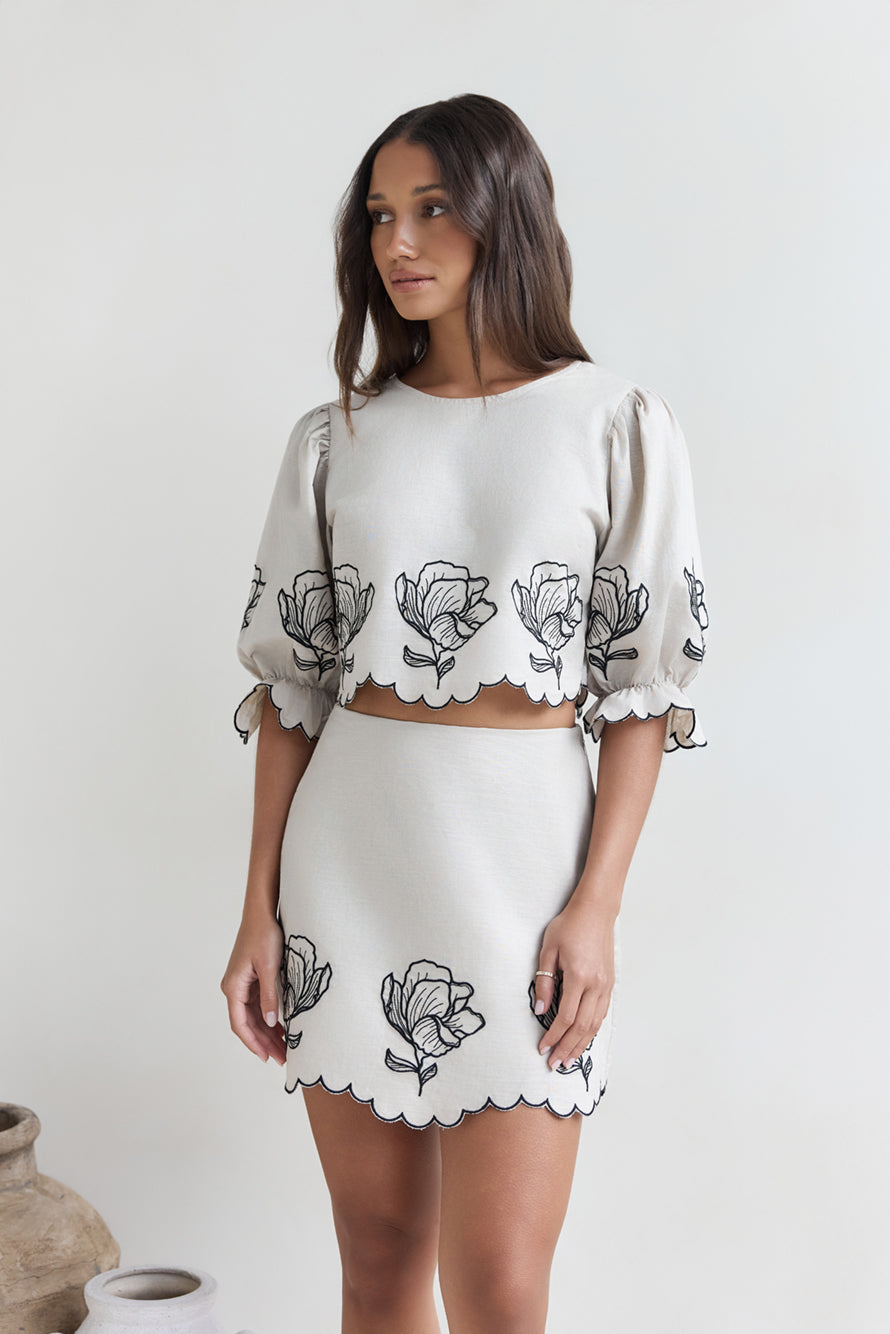 Breezy, romantic, and effortlessly feminine, this two-piece set is a warm-weather dream. The Lovers In Lanai Set is designed from delicate embroidered fabric and features a short-sleeved top with elastic and a high-waisted skirt.