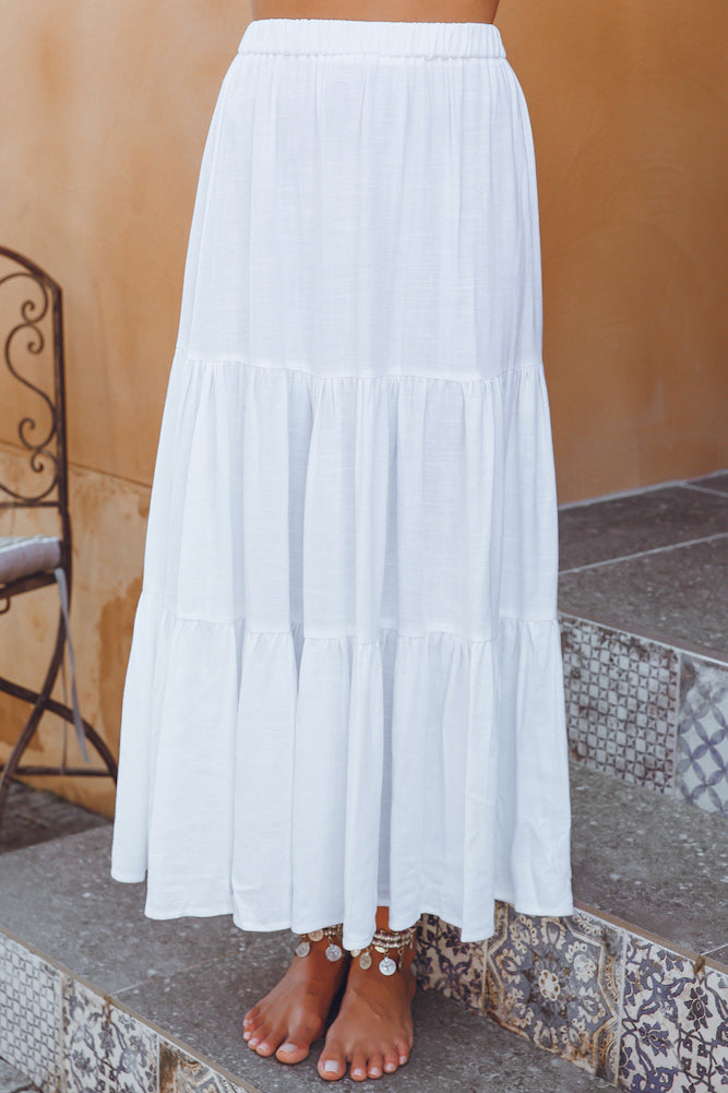 We're dreaming of sunny days and quiet coasts in the Maiora Maxi Skirt! Style yours with a floaty crop and a woven bag.