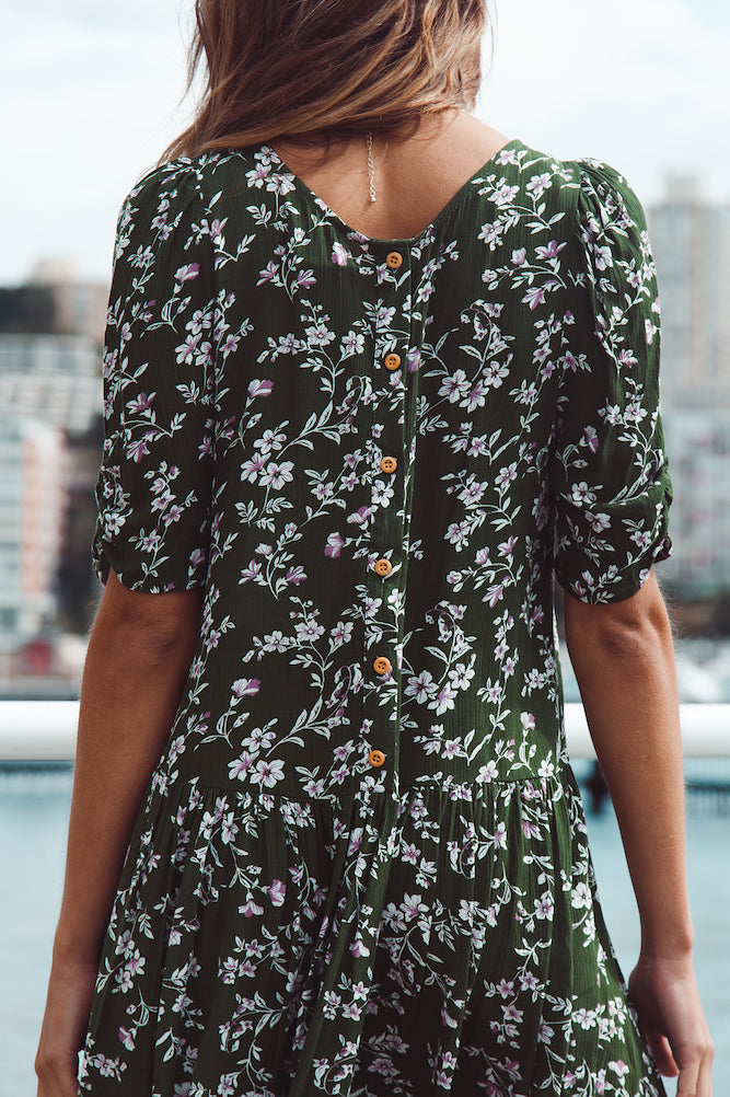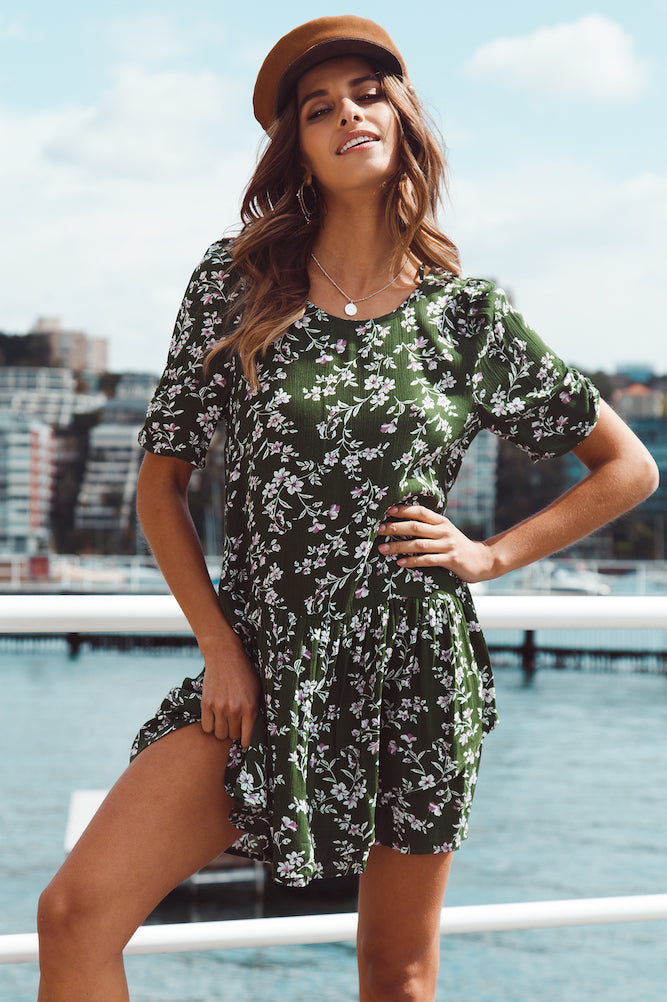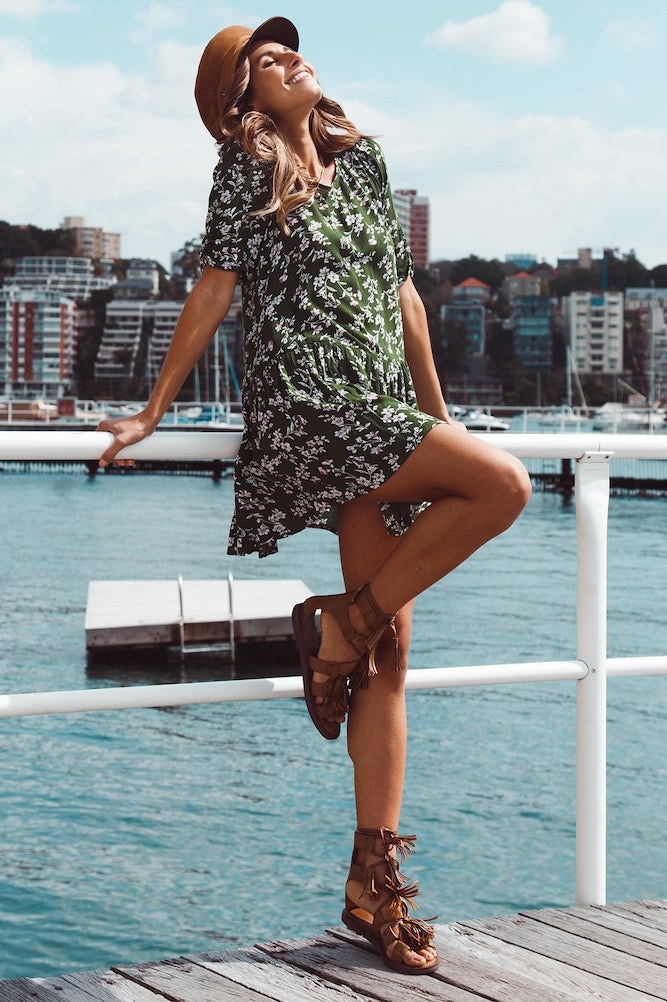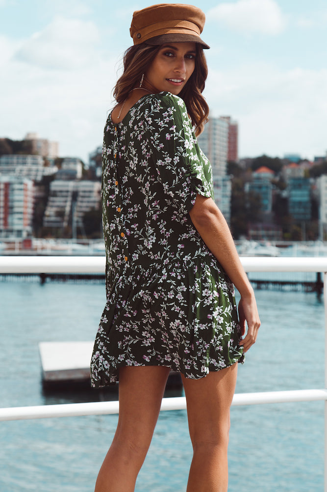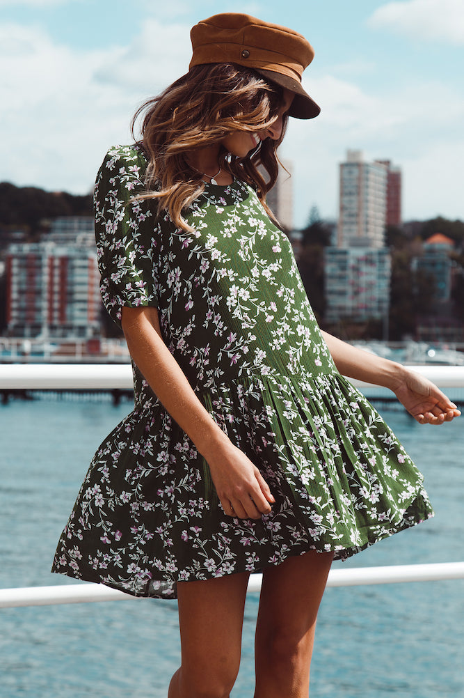 Time for tea in our beautiful Japanese Matcha Dress! The floral pattern is reminiscent of flowering cherry blossoms on our favourite island. This sweet mini dress is finished with a pleated hemline skirt perfect for a mid photo swish! We love styling ours with a baker boy cap and some leopard print boots!