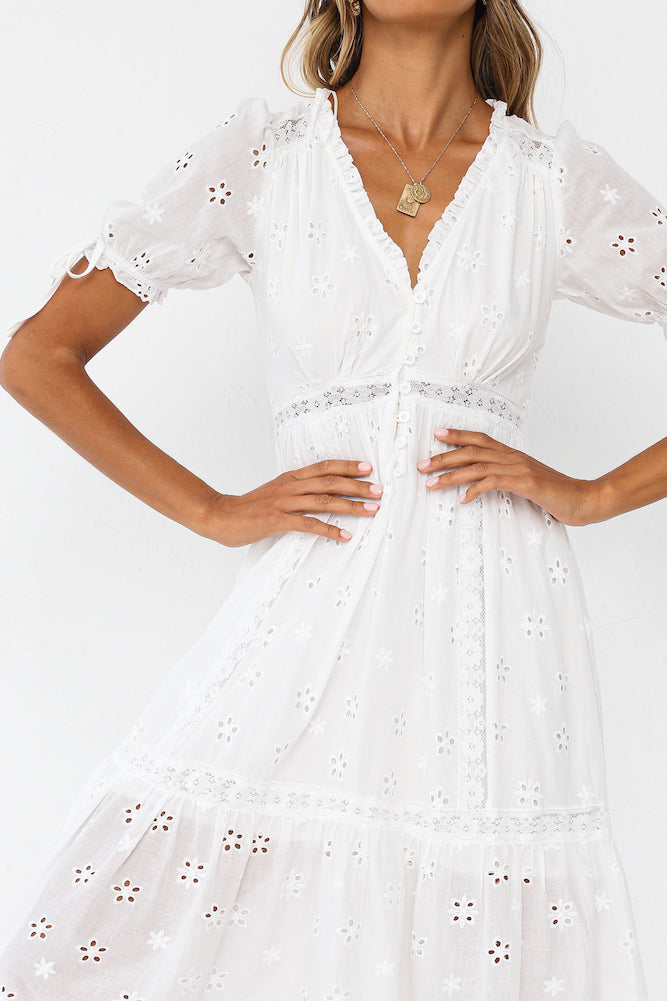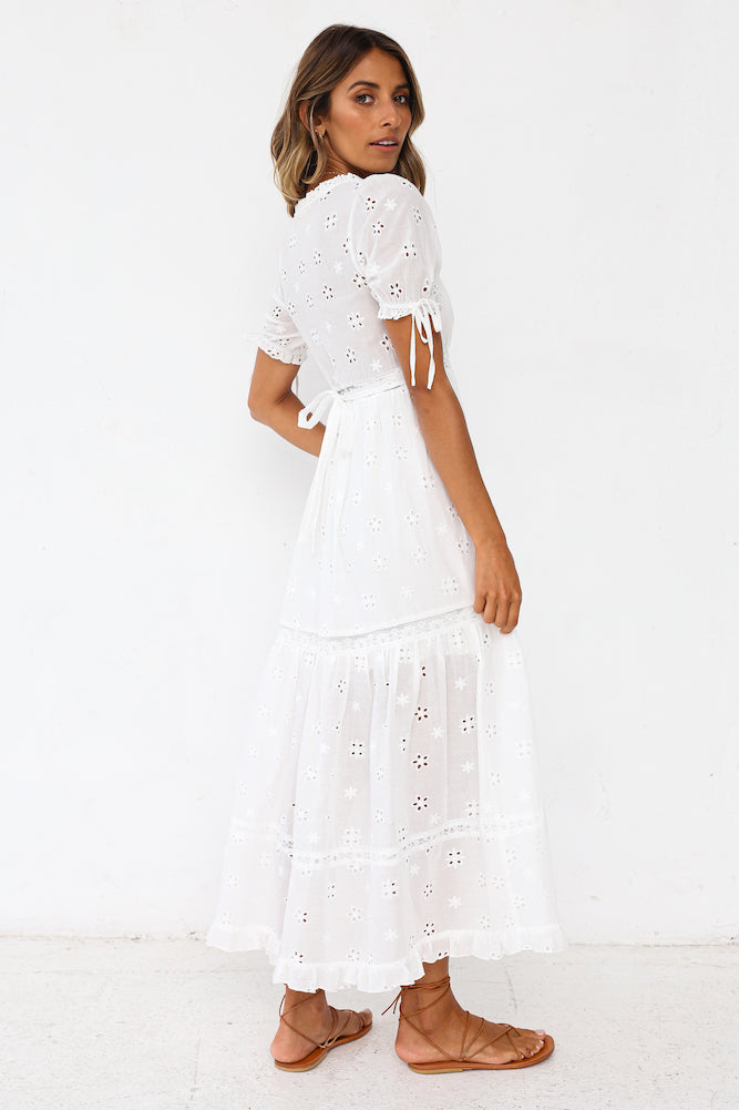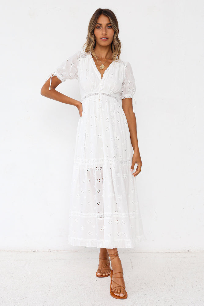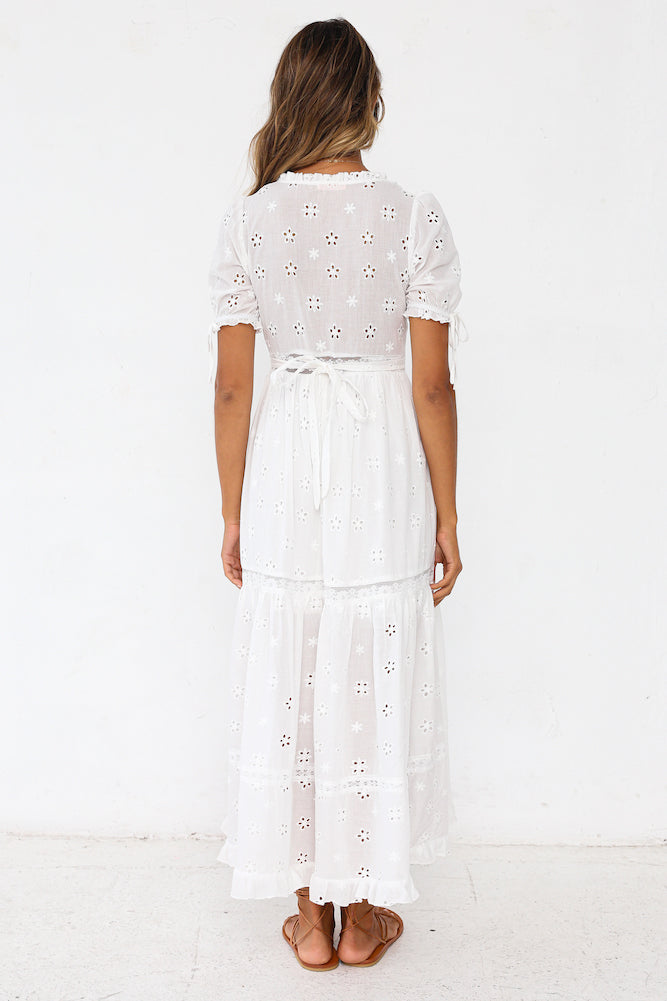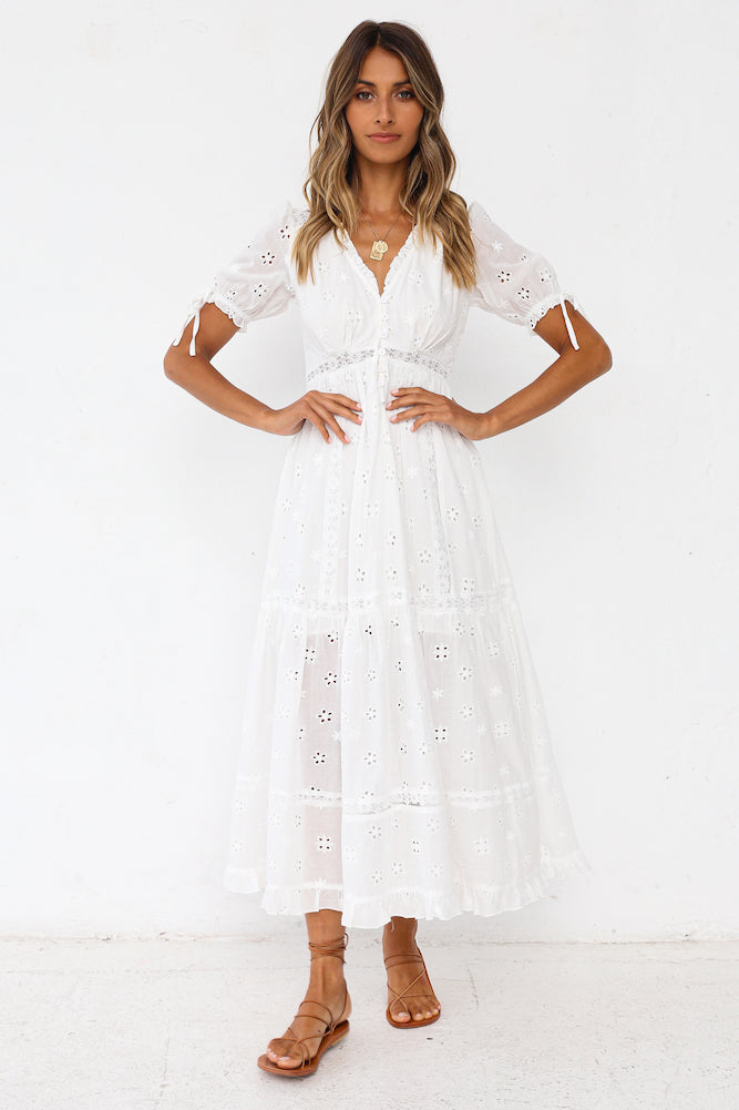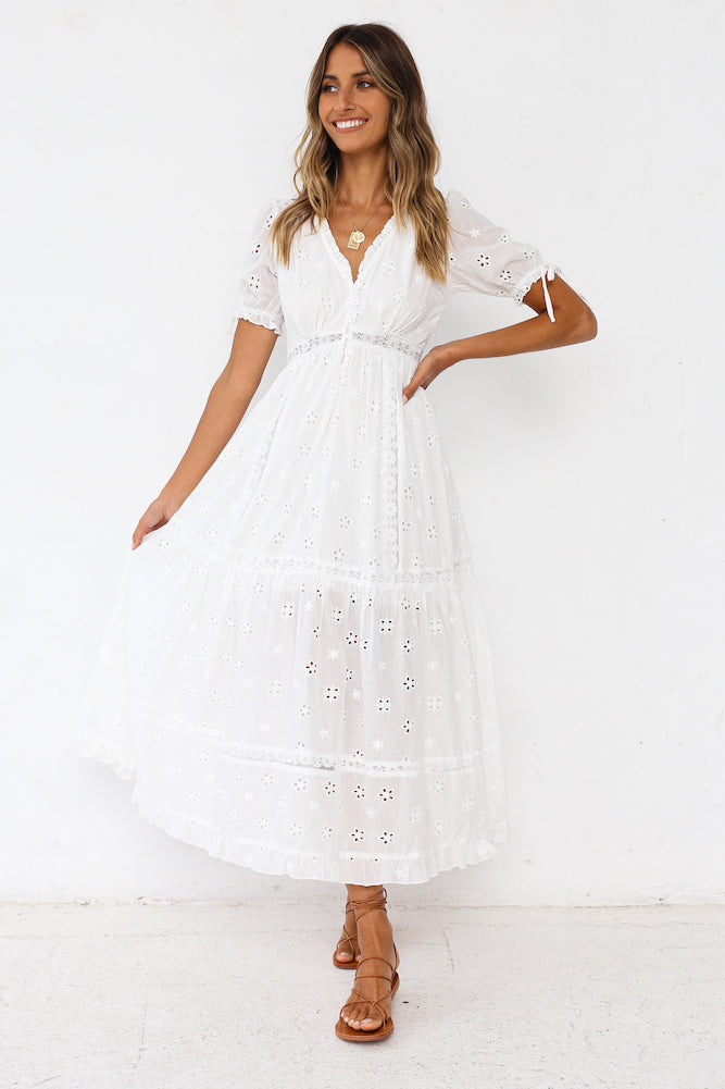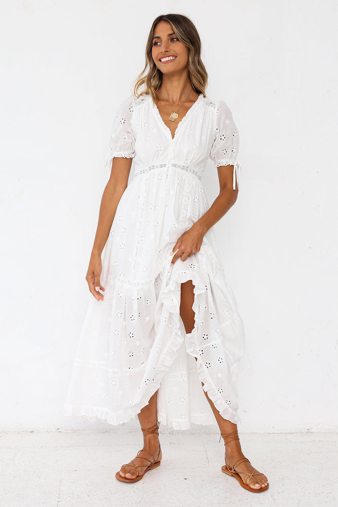Cool summer nights have never been better with the Midrina Maxi Dress White! Style yours with sandals and gold adornments.