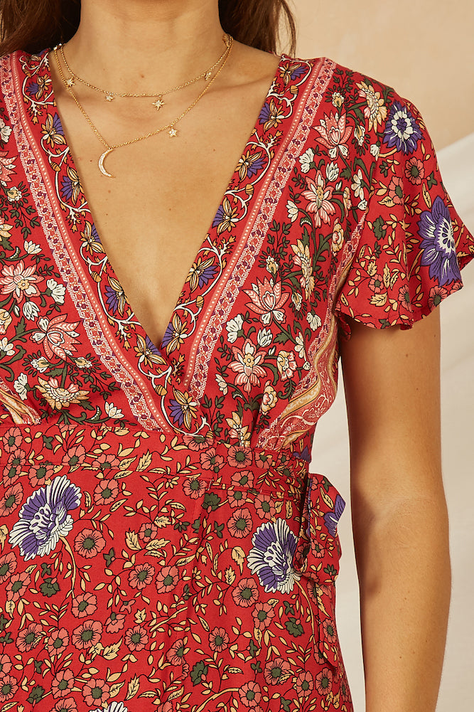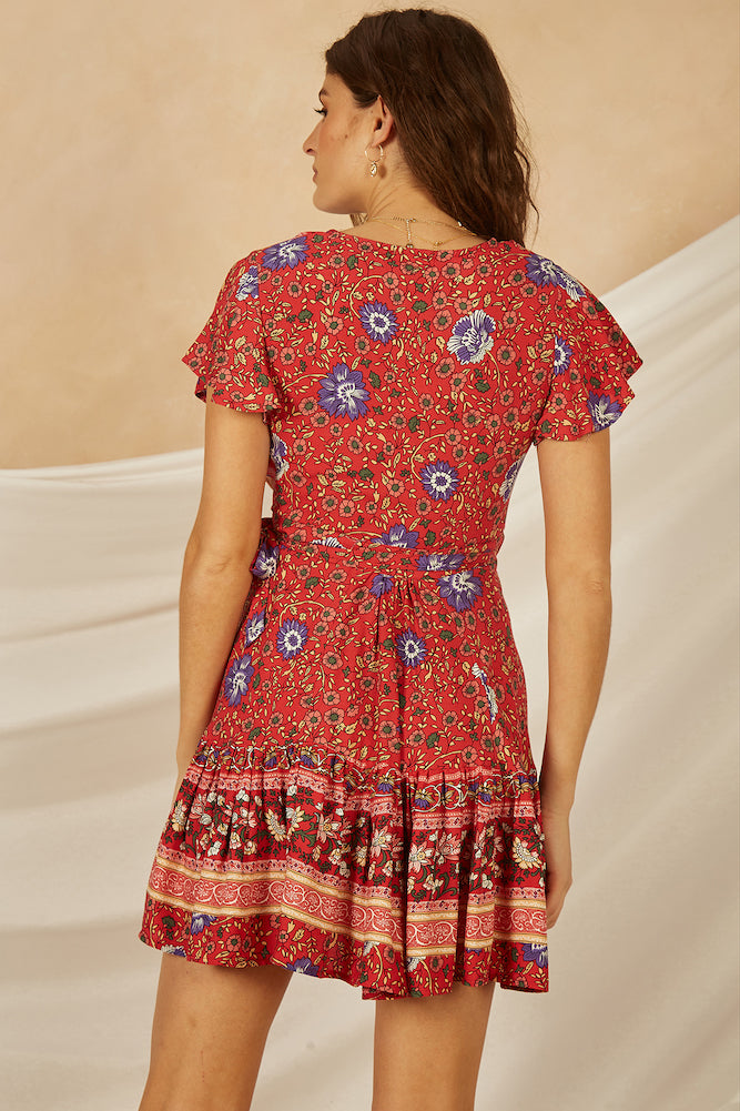 Spend your weekend cafe hopping along the promenade in our dreamy Miraleste Dress! This sweet wrap-style mini has capped sleeves, a subtle ruffle hemline and a intricate floral pattern throughout.