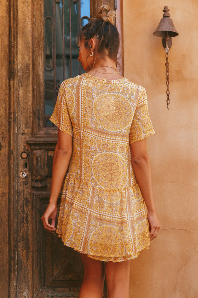 Get ready to explore the backstreets in our Off To The Markets Dress Yellow! Style with strappy sandals and a woven bag.