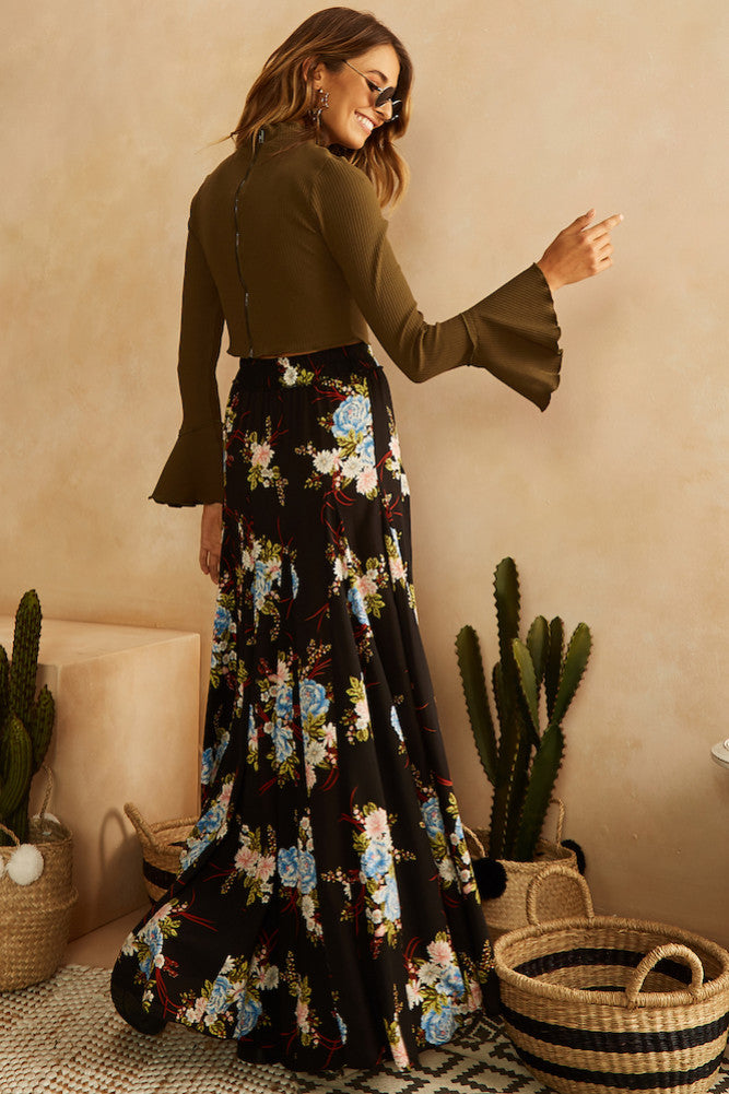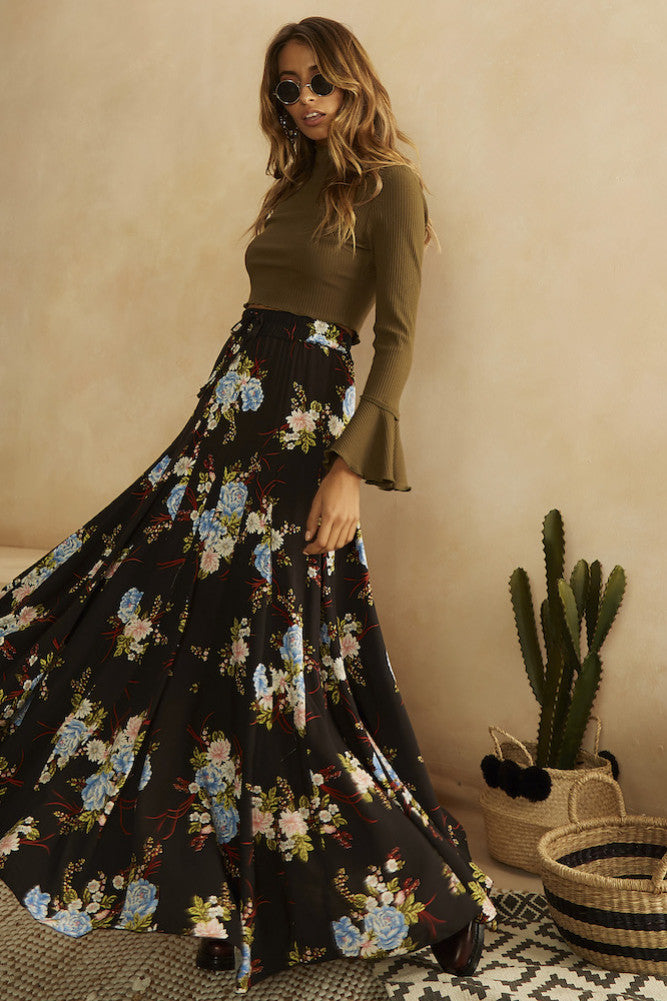 The Olive Orchard Maxi Skirt is a style that's perfect for swishing and swaying at festivals! Pair it with a black bralet and cowboy booties.