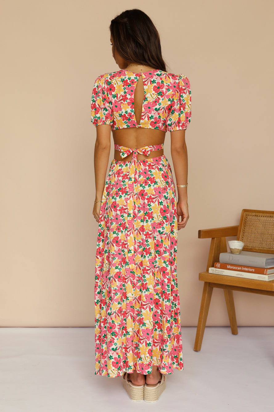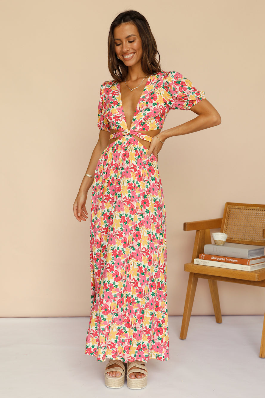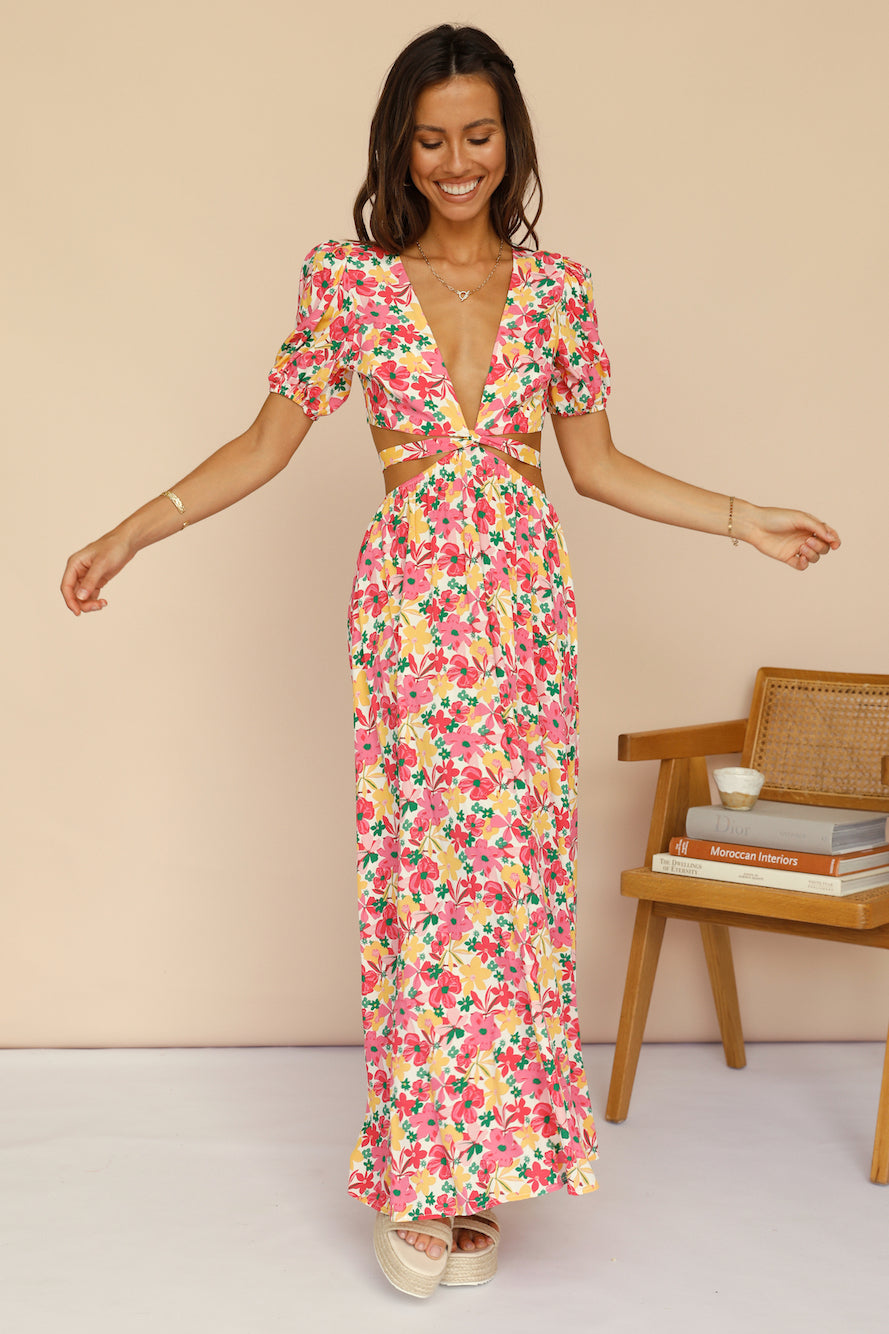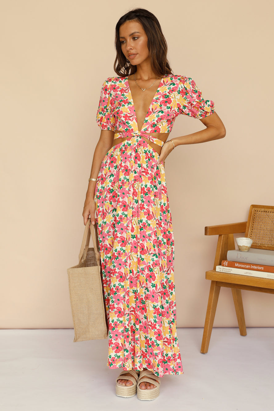 The sweet florals of the Peach Bouquet Maxi Dress have us living on cloud nine under the sun. Style yours with lace-up sandals and gold adornments for your next picnic date.