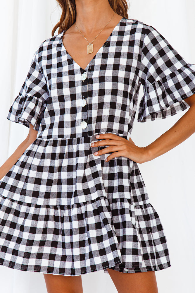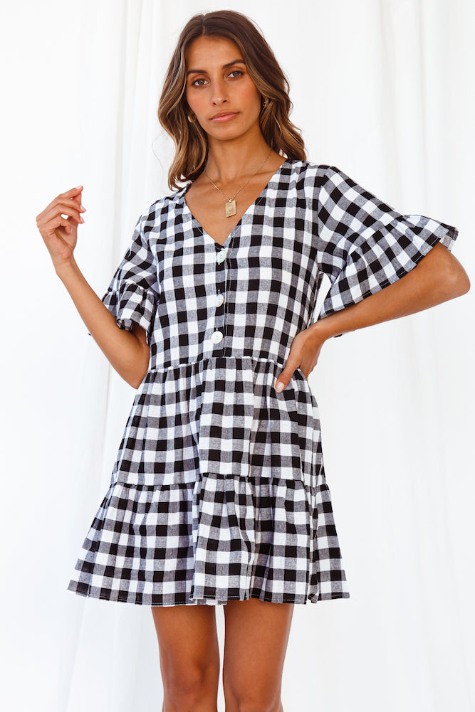 The only time you should 'be square' is when frolicking in our Picnic In The Park Dress! team this moody monochromatic dress with matching wedges and sun-kissed skin.