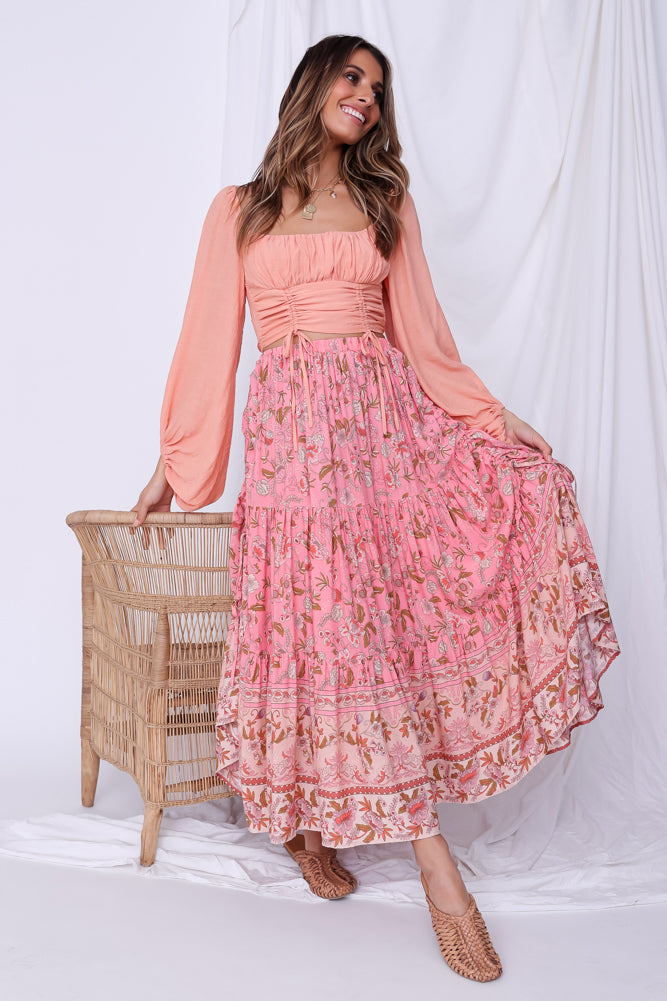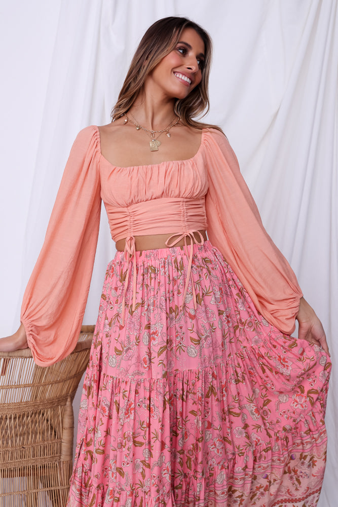 We're easing into a breezy and sunny weekend when we wear the ruched, billowy Planting Seeds Crop Top. We see you wearing yours with a ruffled white mini skirt with jute wedges.