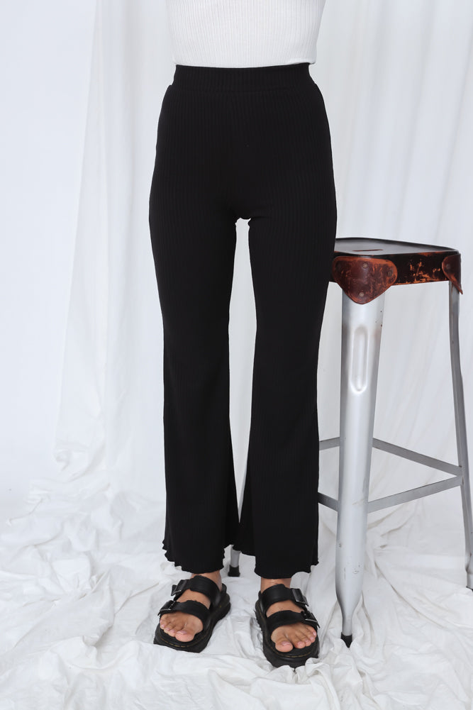 We're keeping cosy on the couch with a planet, a cup of hot chocolate and our Strawberry Wine Pants. We're teaming these flared pants with a cosy knit top and socks.