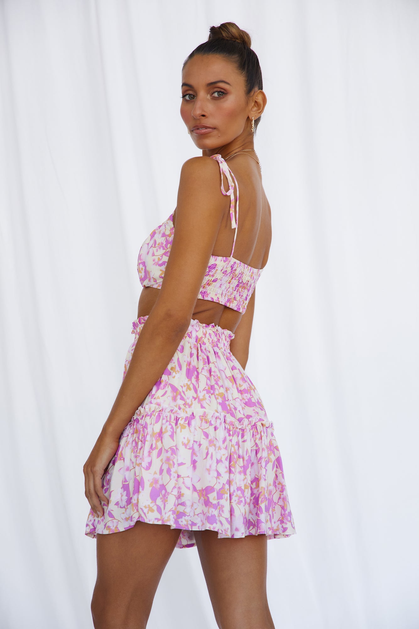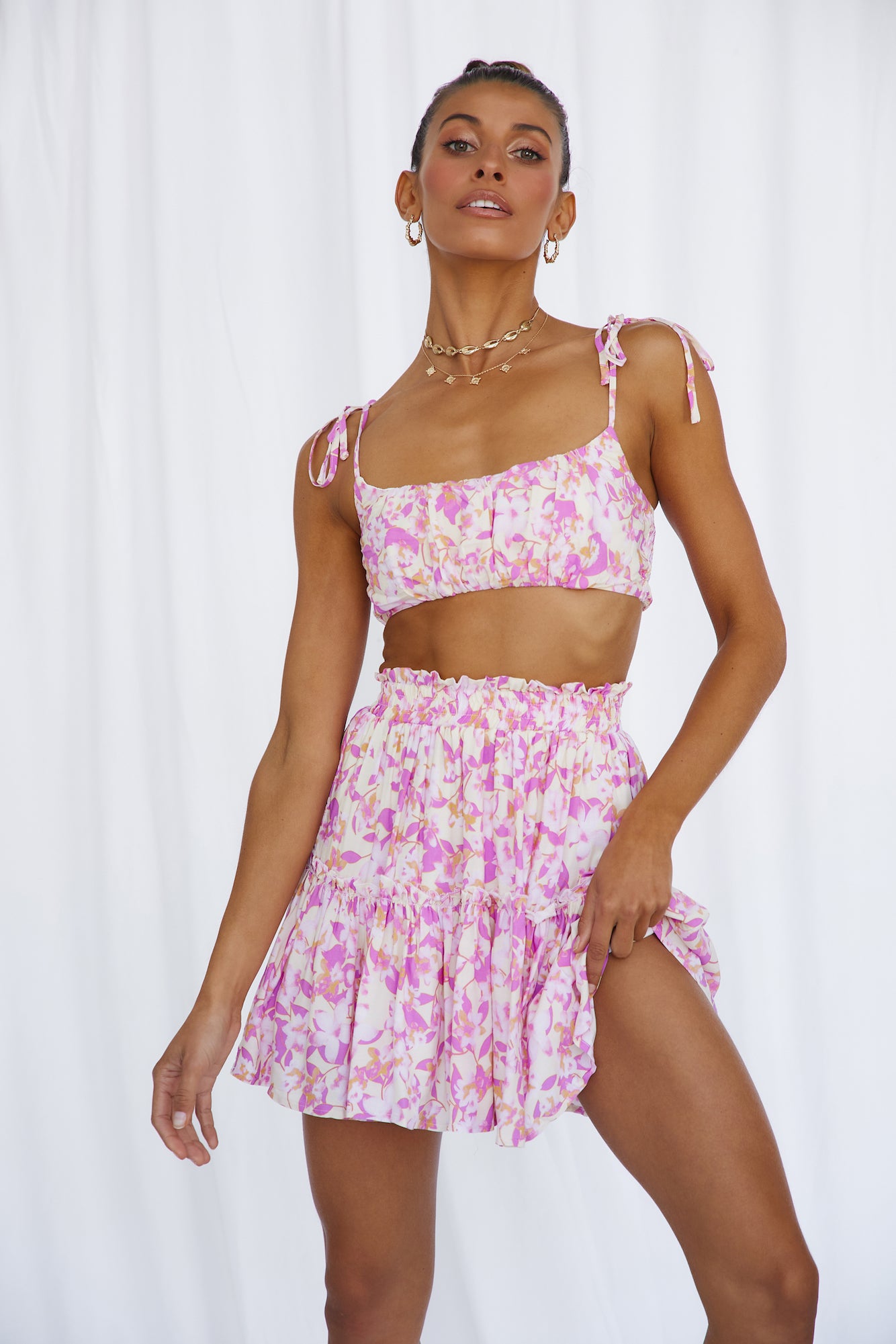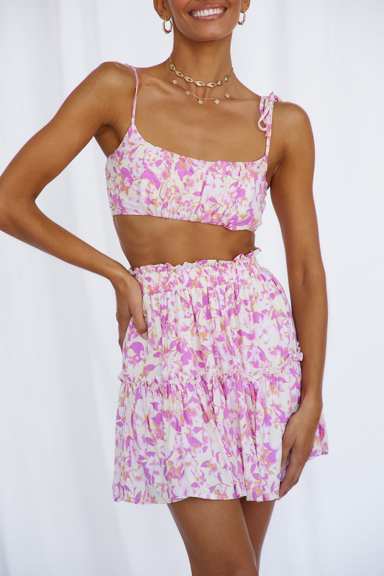Feel the sun beaming down and continue dancing in our Swaying Heart Crop Top! We'll be styling ours with the matching skirt and gold adornments.