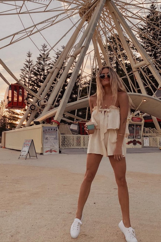 Slip into something breezing whilst you spend your afternoon watching the sun fall into the horizon. Featuring a sweet ruffle design with a tie up backless detailing is what makes our Terramar Romper so unique. We're styling ours with a ivory rancher hat, cool shades and strappy sandals!