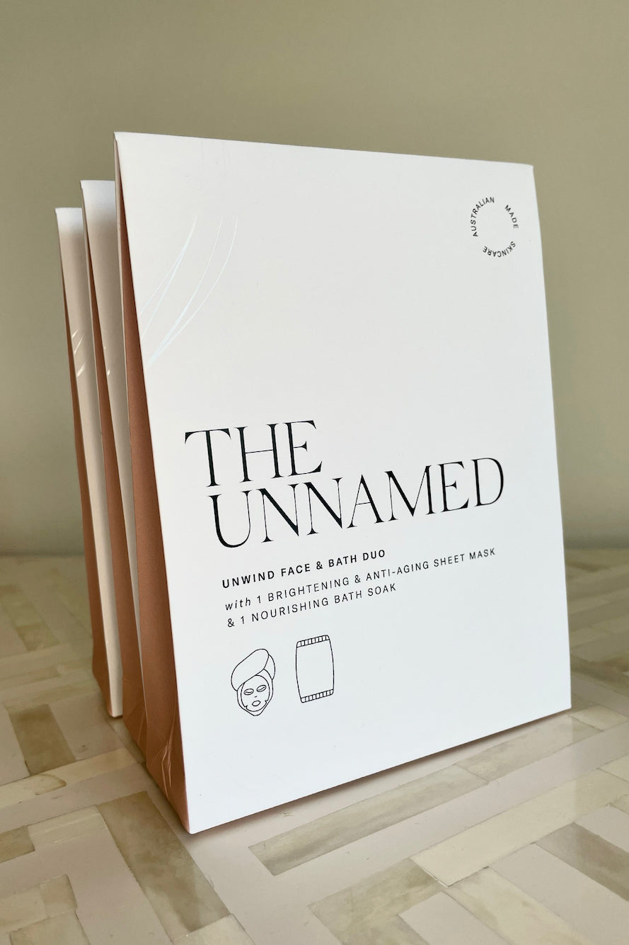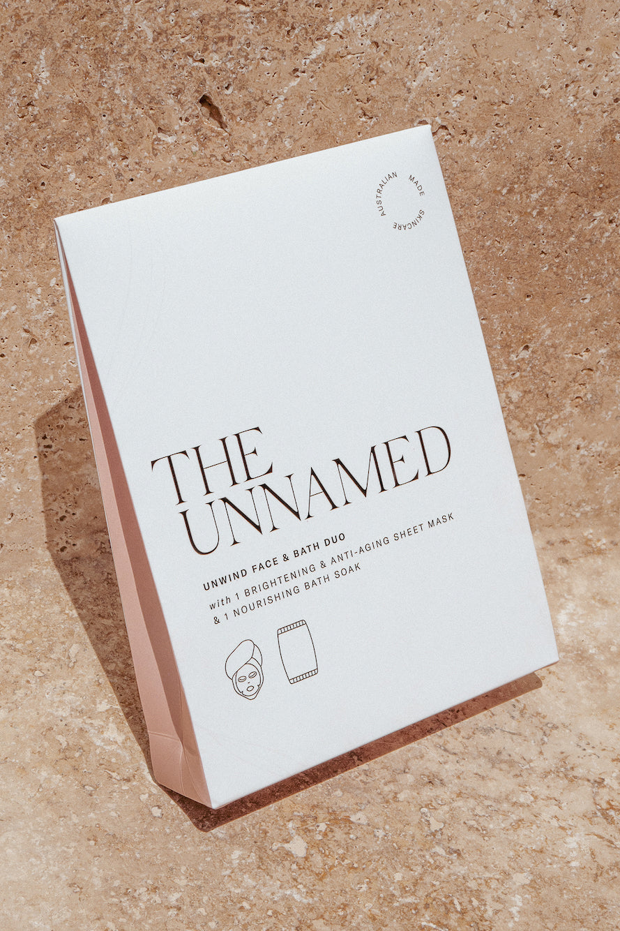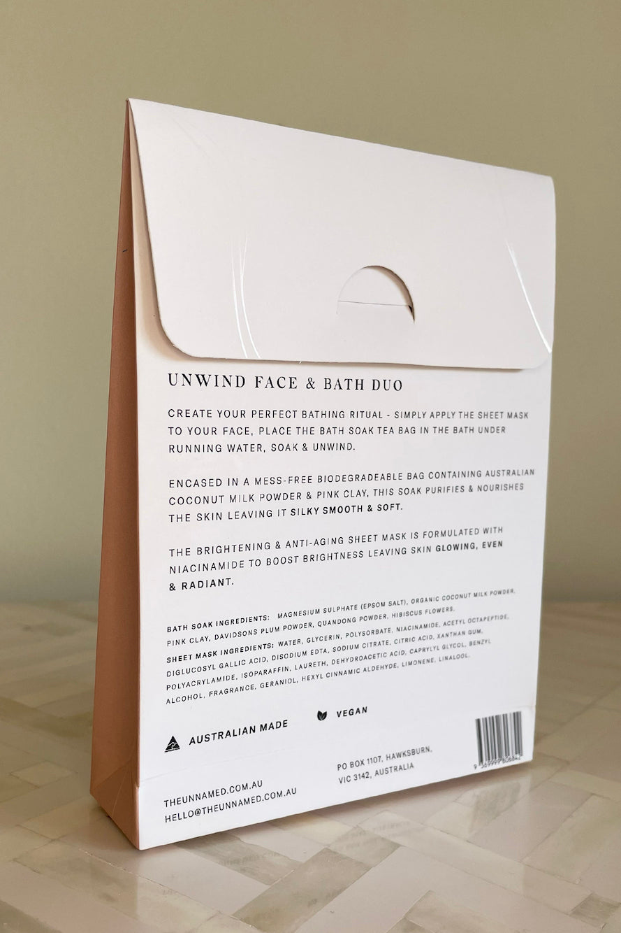 The Unwind Face & Bath Duo Set is designed to create the perfect bathing ritual at home. Simply apply the Brightening & Anti-Aging Sheet Mask to your face, place the Nourishing Bath Soak in the bath under running water, soak & unwind.