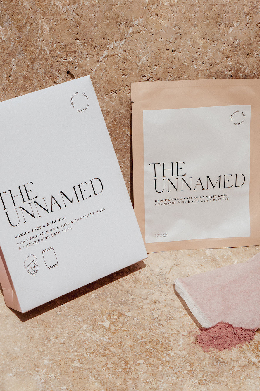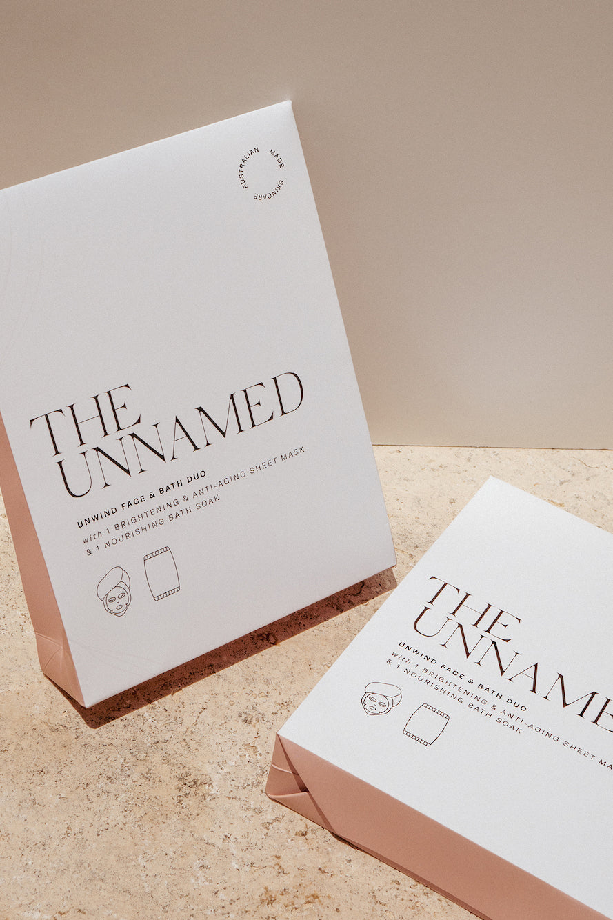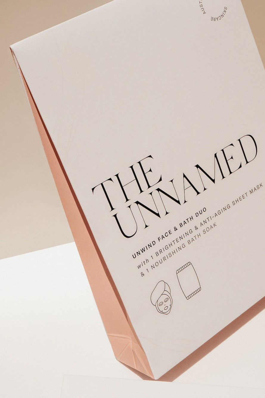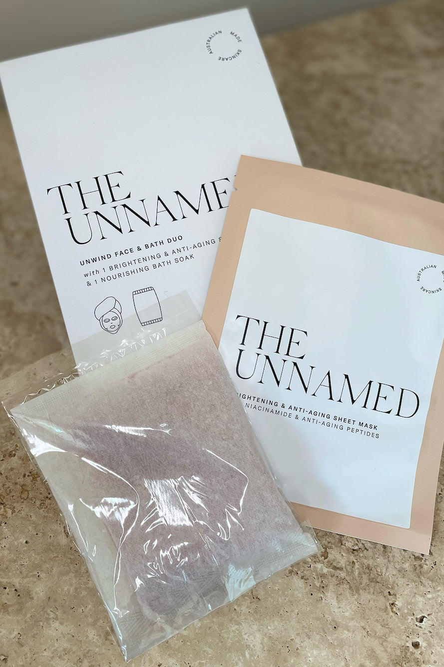 The Unwind Face & Bath Duo Set is designed to create the perfect bathing ritual at home. Simply apply the Brightening & Anti-Aging Sheet Mask to your face, place the Nourishing Bath Soak in the bath under running water, soak & unwind.