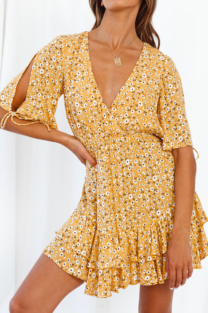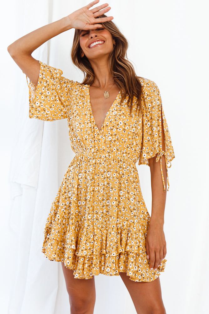 Skip into s whirlwind getaway the right way in our frilled and extra lush Tucana Dress! This floral printed mini is perfect for all your warm-weather frolicking in the Spanish countryside!