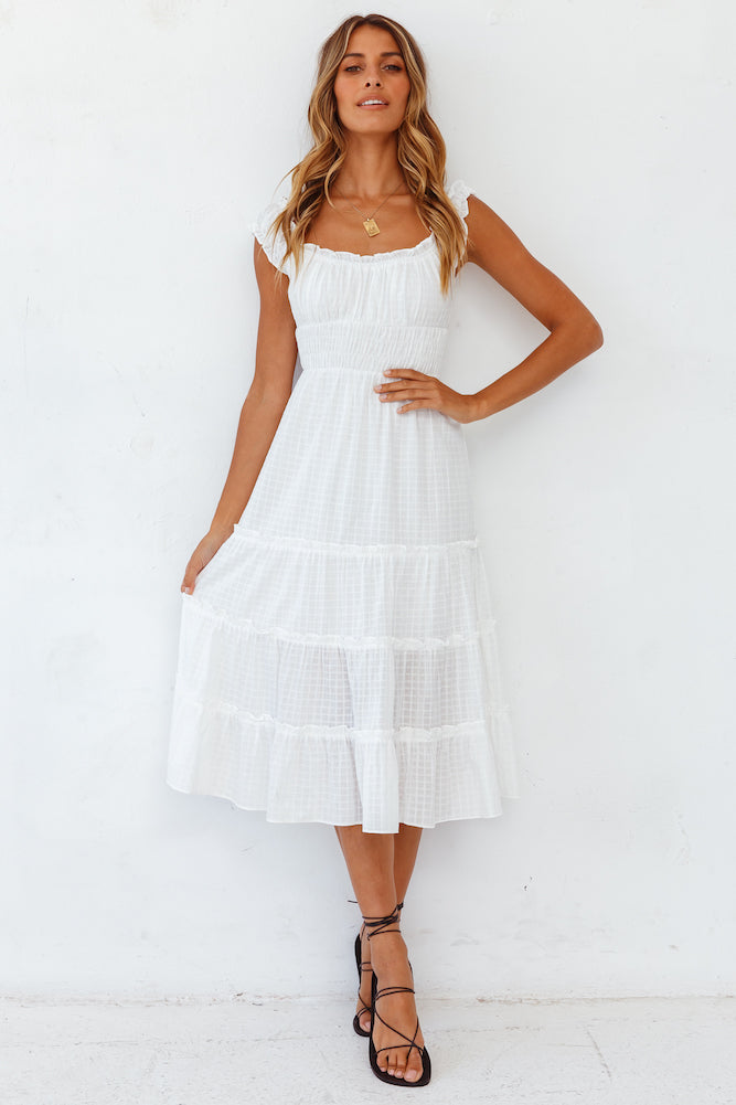 We're dreaming of golden sunsets from the Juliet balcony in Paris with the Varela Midi Dress! Style this whimsical white dress with gold adornments and flowy hair.