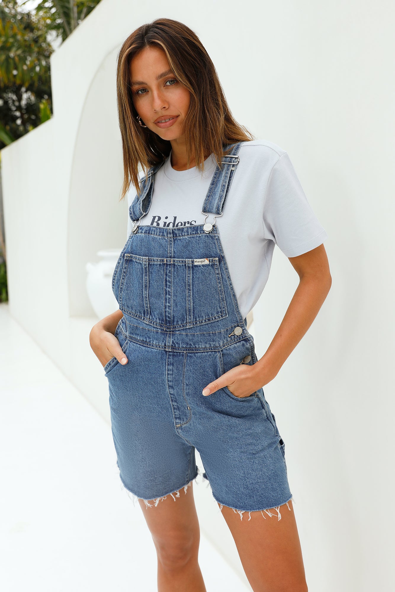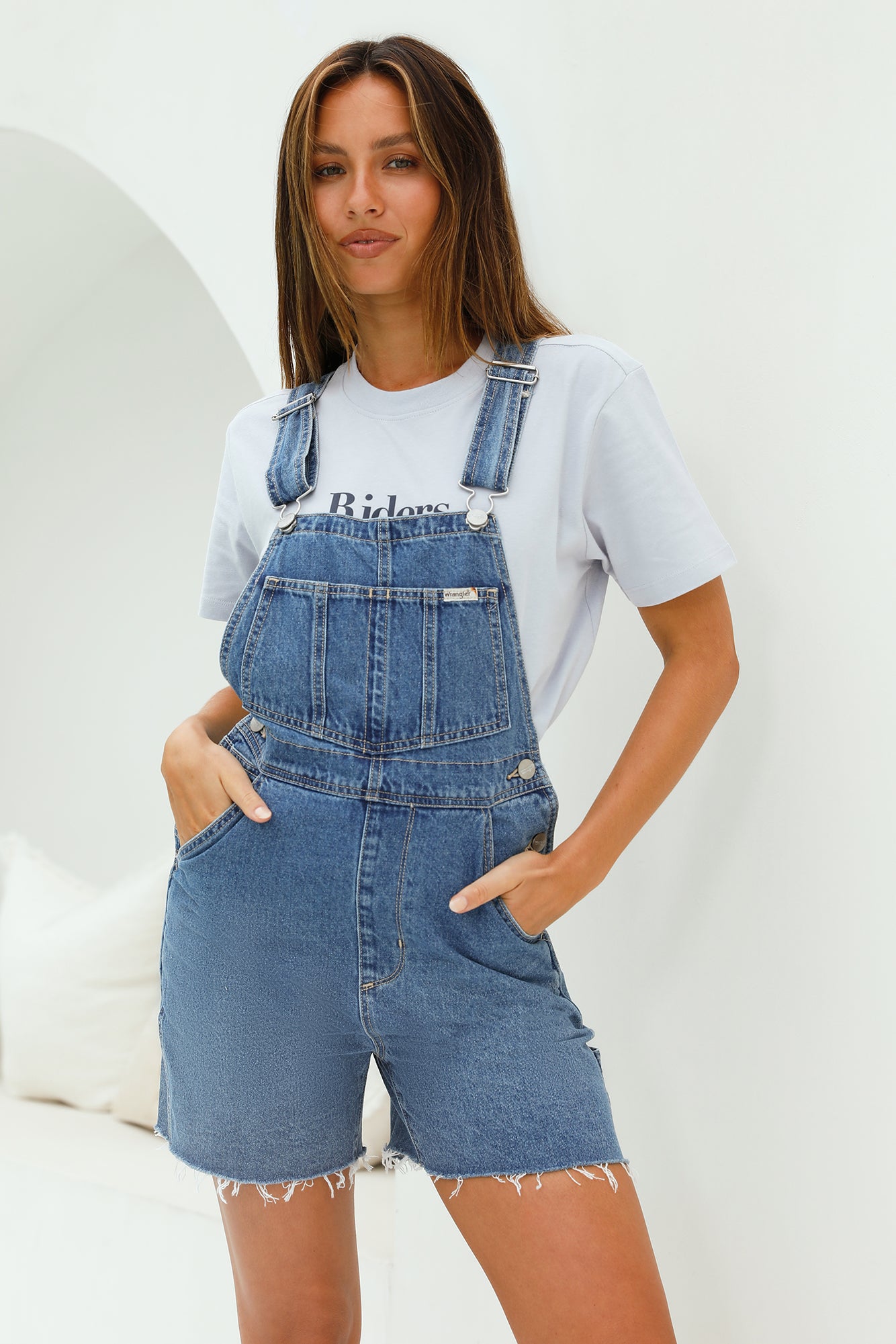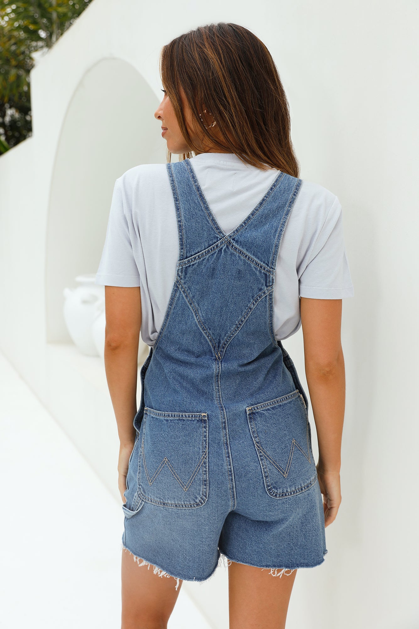 The WRANGLER Get Gone Dungaree in Woodstock Blue is a rugged and fashionable workwear-inspired denim piece, featuring a timeless blue hue that embodies a sense of adventure and durability. Style with a white tank underneath and sneakers to complete the look.